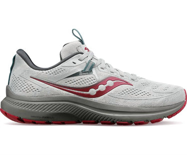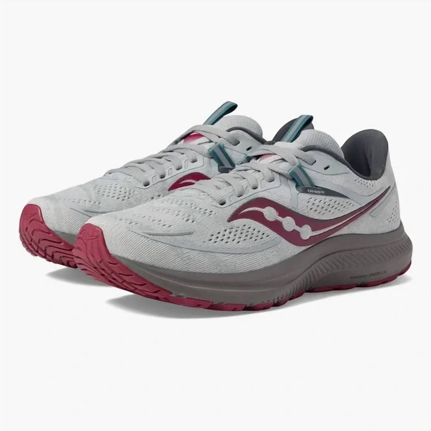 Experience comfort and support with the Women's Omni 21 Running Sneakers by SAUCONY in Concrete/Berry. These sneakers are built with dual-density PWRRUN cushioning that offers a lighter and softer feel, perfect for your everyday routes. The seamless marled mesh upper and supportive webbing ensure a personalized fit, complemented by a durable rubber outsole for stability. These vegan-friendly sneakers redefine feel-good running for the modern woman.