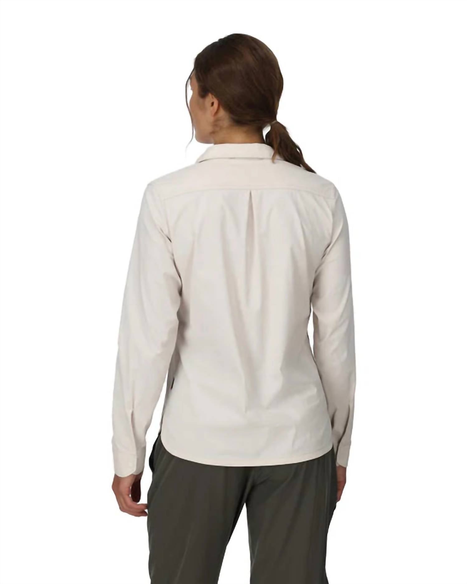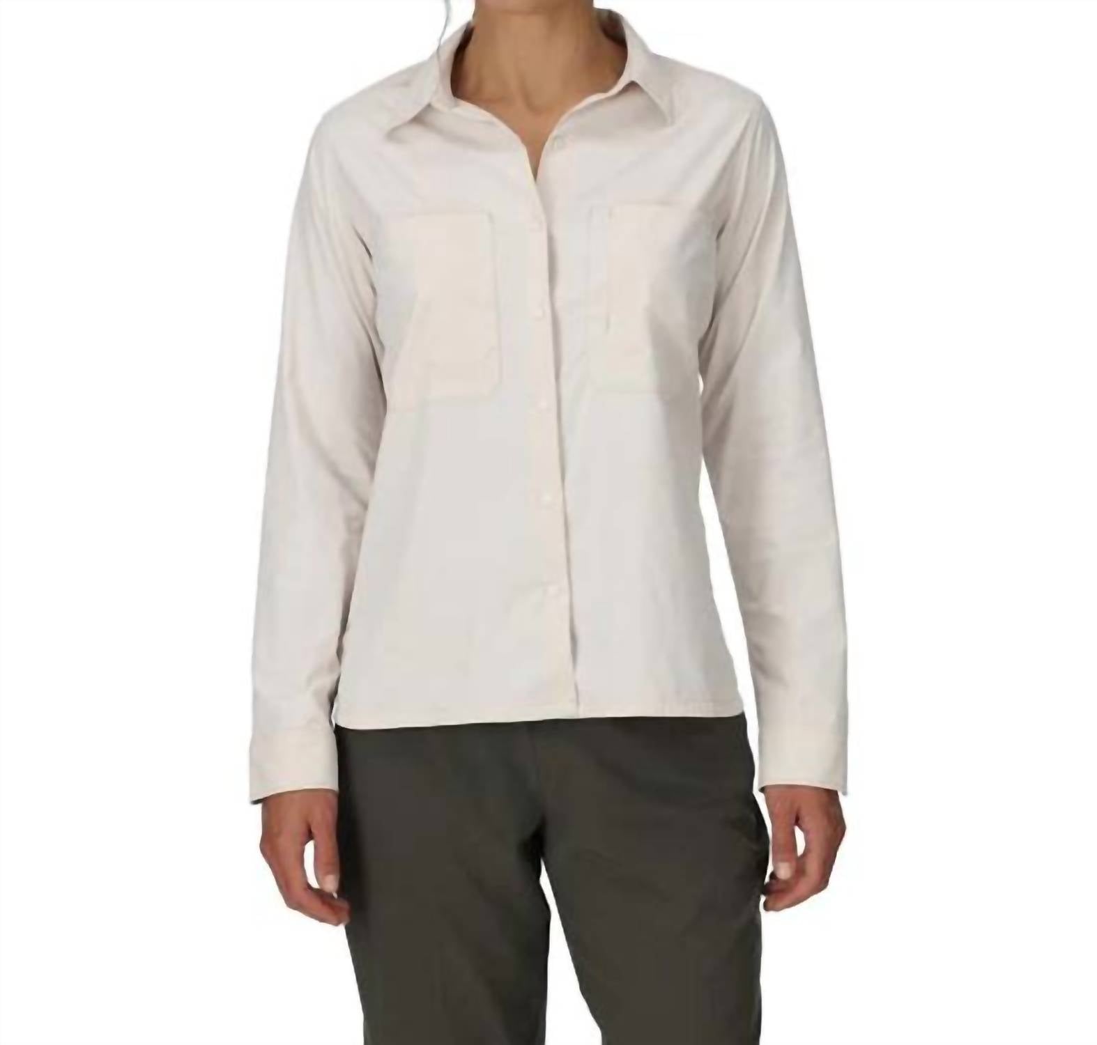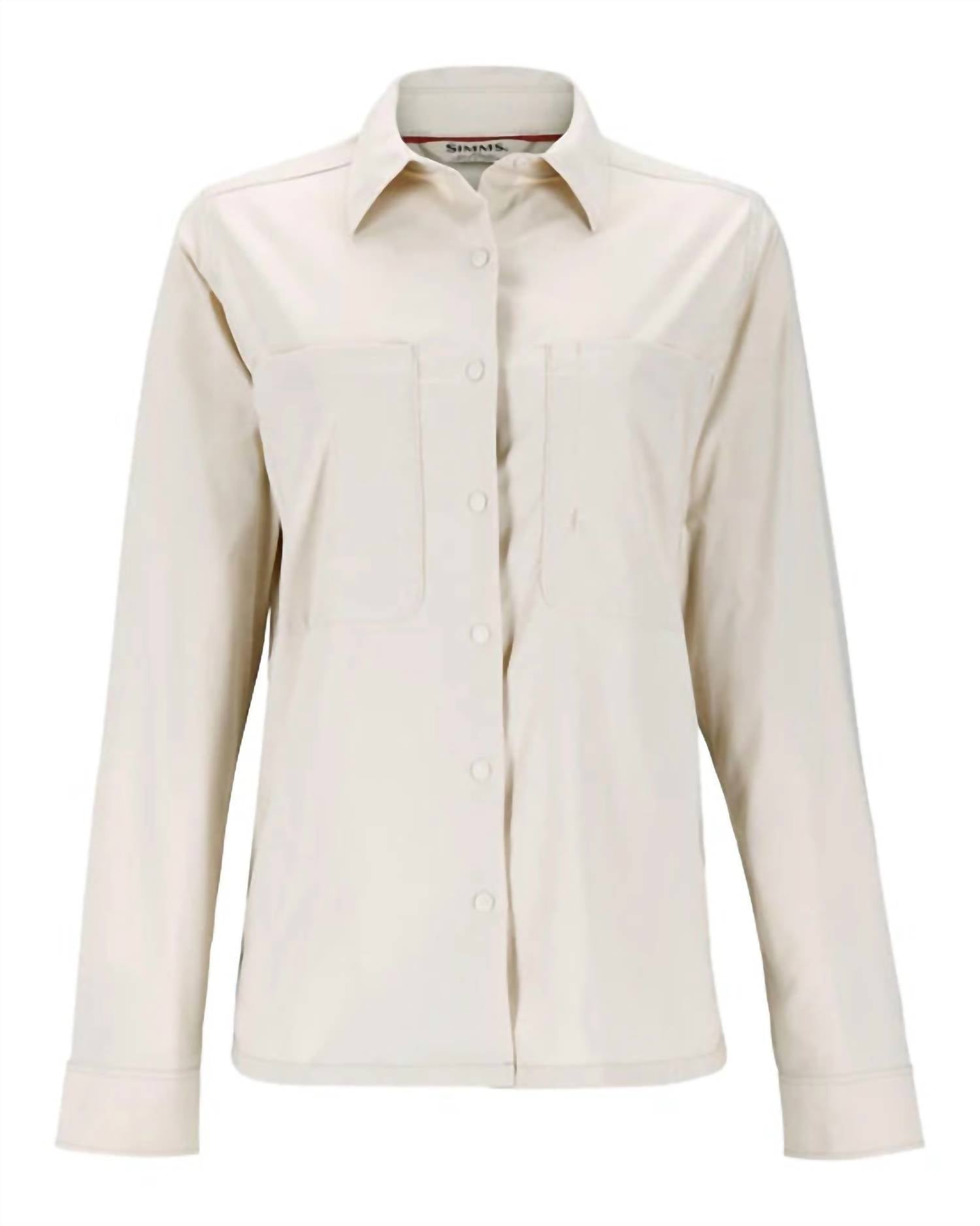 Discover the Women's Shearwater Shirt by SIMMS, designed in a soothing Dusk hue for your on-water adventures. This long sleeve shirt features stretch woven fabric and a back pleat for enhanced mobility, complete with a snap front closure. Crafted from 93% Nylon and 7% Spandex with a 111 gsm fabric tech that offers Odor Block and DWR finish. The design incorporates two large drop-in chest pockets with a sunglass stasher and a zip pocket at the waist, making it both functional and stylish.