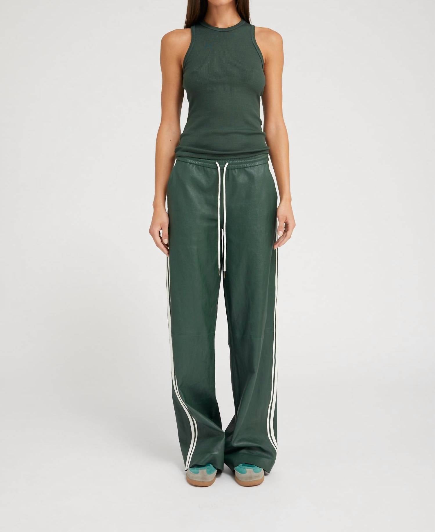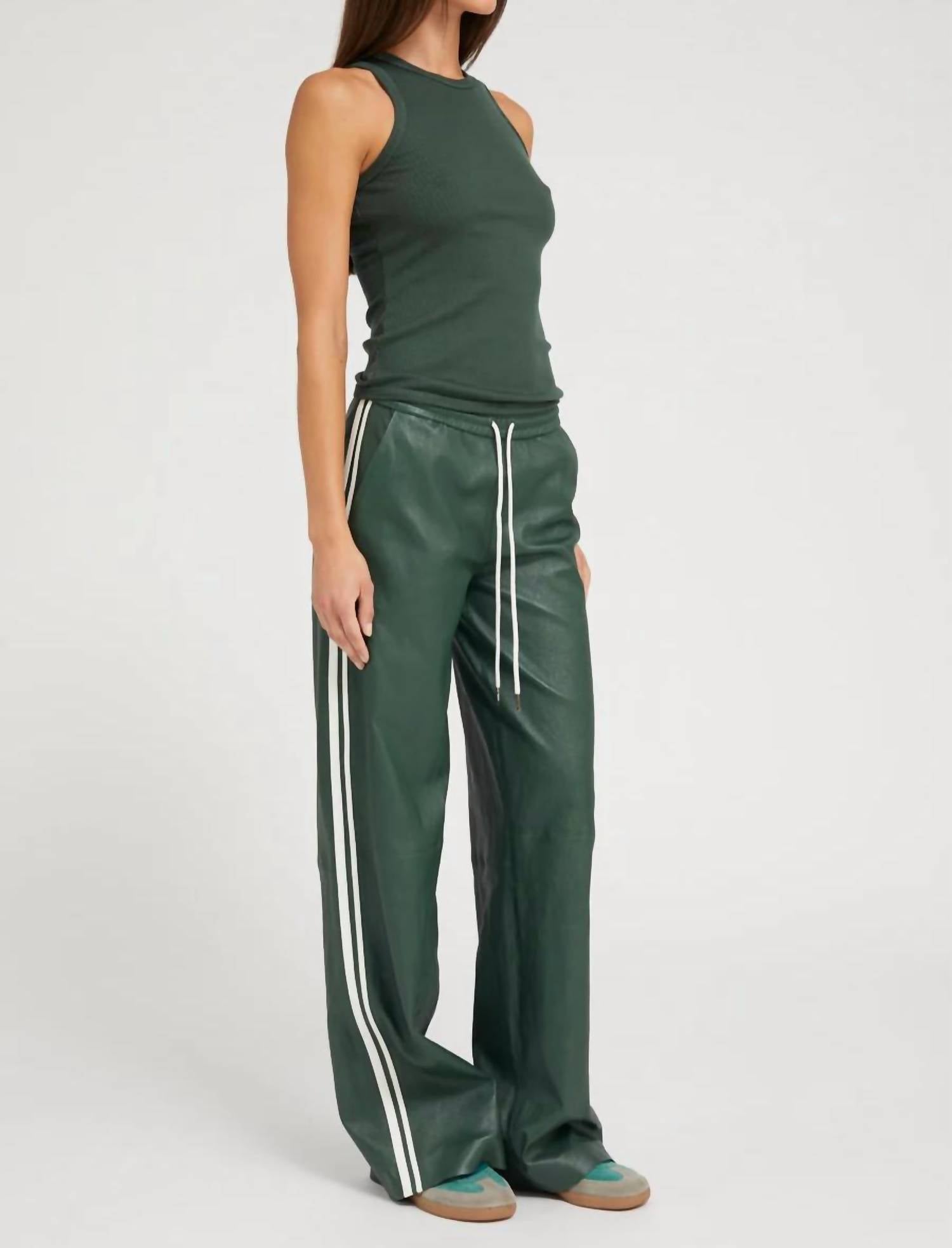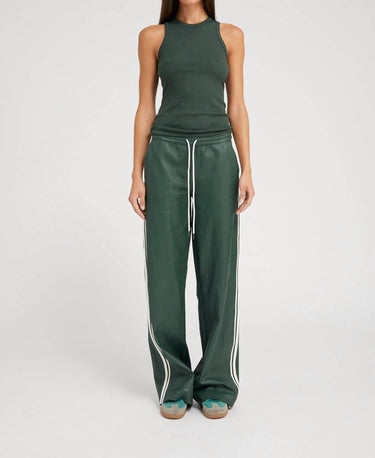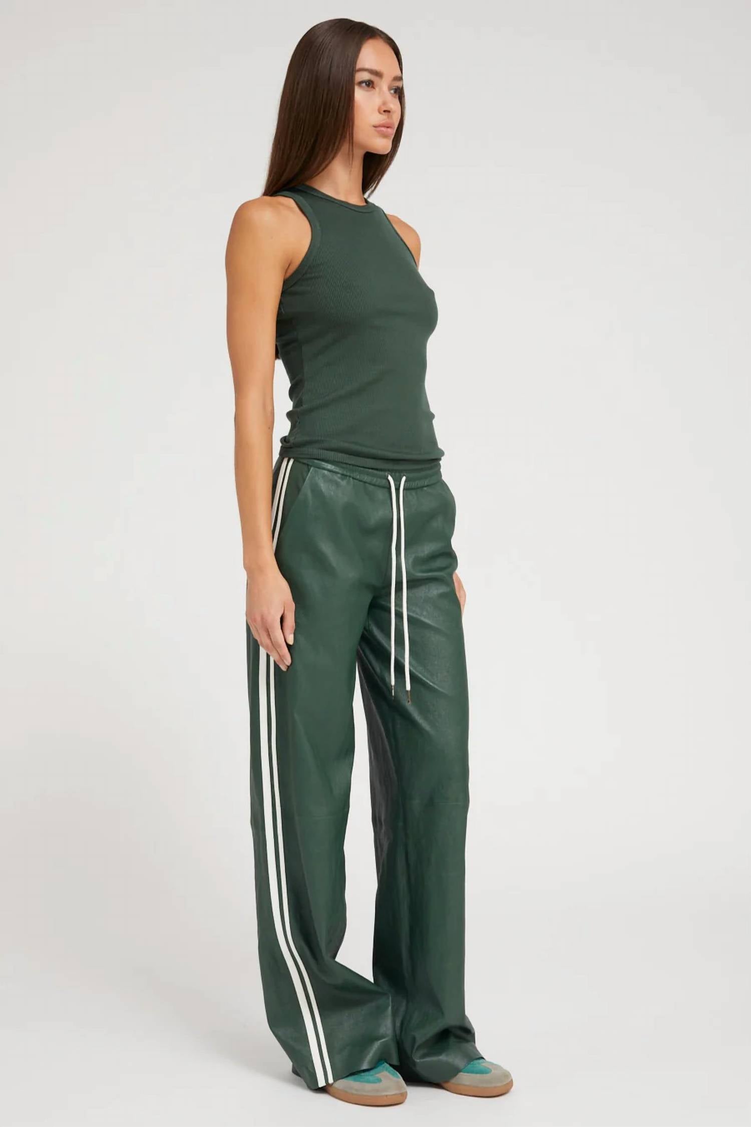 No gym necessary for these cool-girl joggers. Elevate your sporty style with the Ivy Baggy Athletic Track Sweatpants by SPRWMN in Dark Green. These track pants feature a relaxed, wide-leg fit with chic white athletic stripes down the sides, embodying a luxe sportswear vibe. Crafted from buttery-soft French stretch-leather, the cotton blend promises a second-skin feel with year-round breathability. Designed with an adjustable drawstring for customized waist fit, these pull-on track pants with pockets are your ultimate partner in comfort and style.
