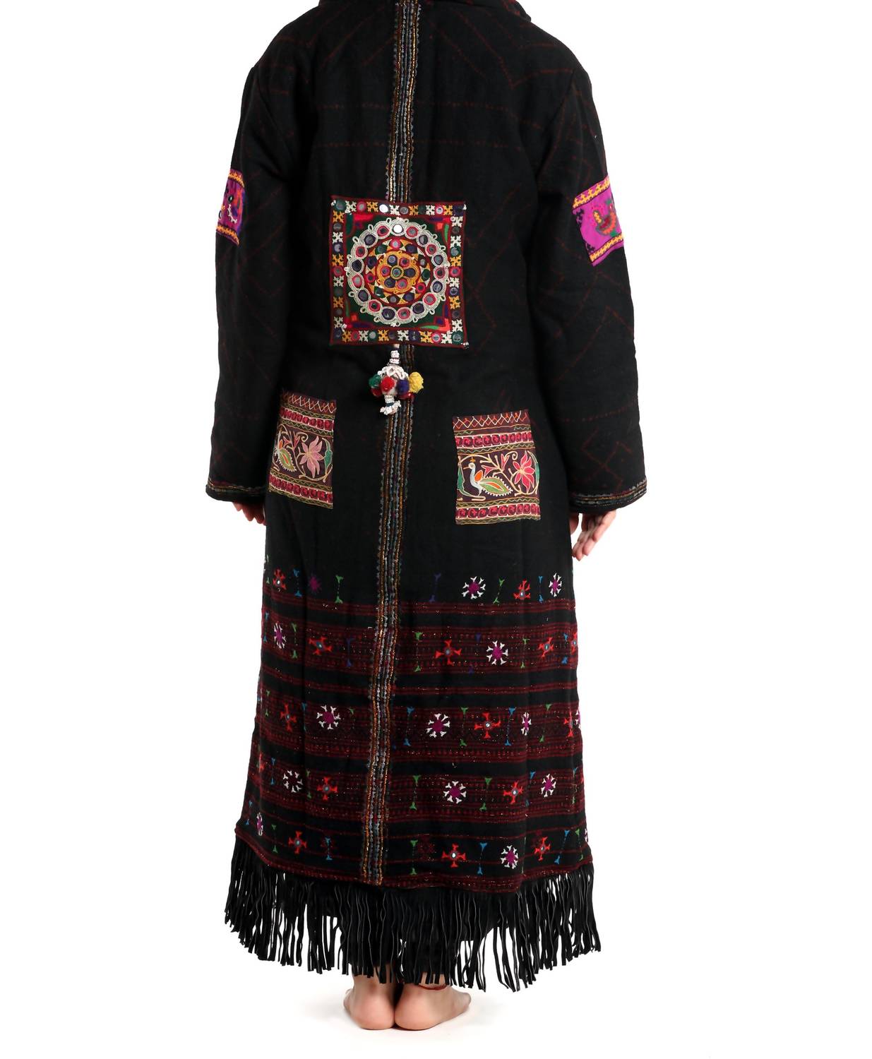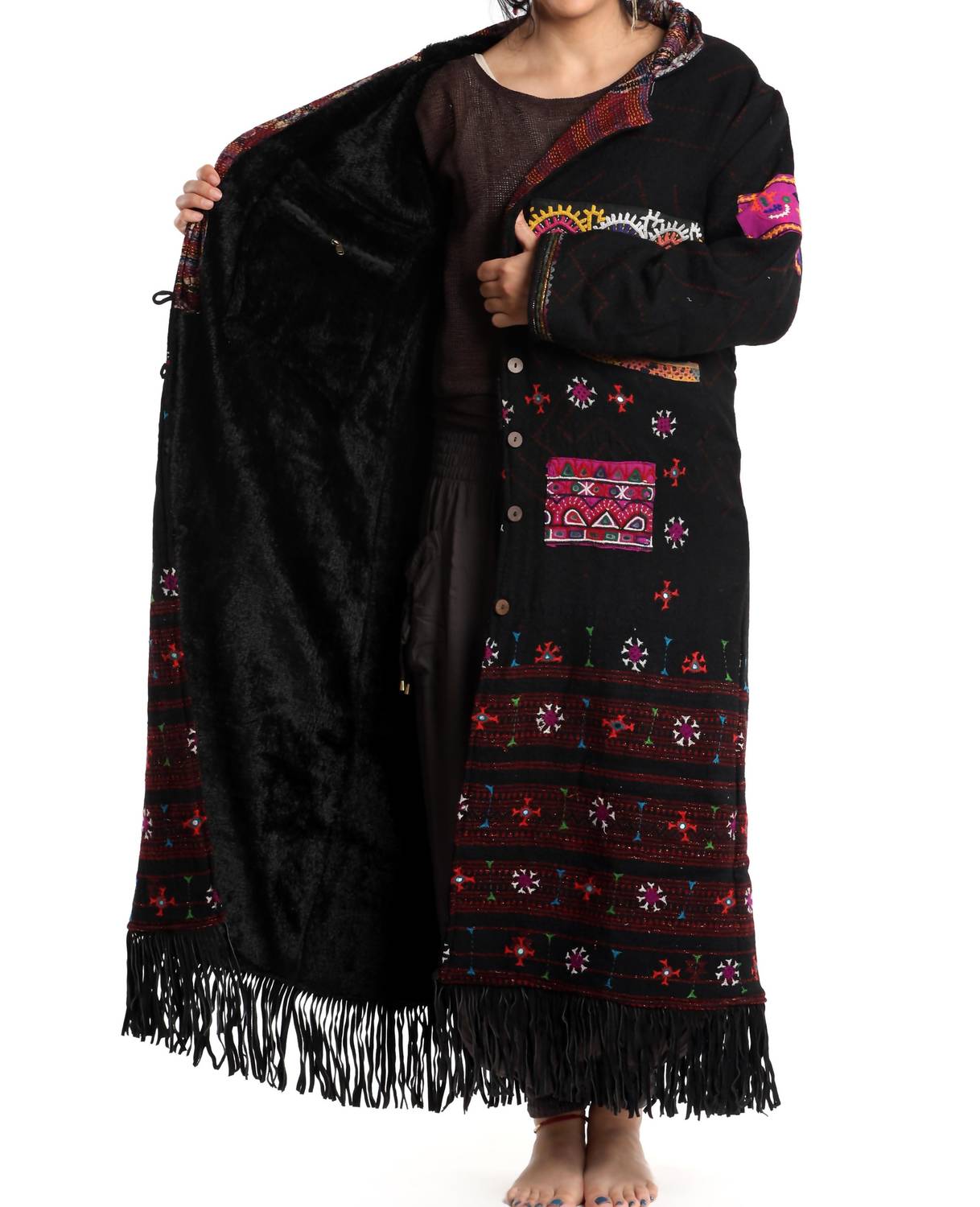 Elevate your winter wardrobe with StandAwt's Signature Wool Coat, a standout piece in black and purple designed for both women and men. This long sleeve coat is composed of 100% merino wool and features faux fur lining for added warmth and comfort. With a length of 47 inches including fringe and a regular fit, it offers both style and functionality with a button closure and multiple pockets including a secret one. Care is simple: hand wash and lay flat to dry. Perfect for a winter vacation or boho chic events, this reversible coat is a statement-maker.