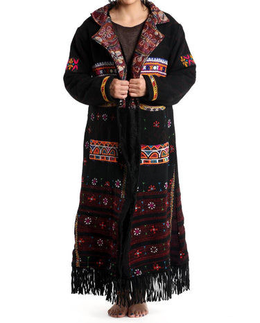 A jacket so versatile you can literally wear it with anything. Discover the StandAwt 1st Edition Signature Winter Coat, an extraordinary piece in a captivating black, pink, and white design. This long sleeve coat features a blend of 100% merino wool with a luxurious faux fur lining, providing warmth and comfort with a standout collar embellished with hand-embroidered patches and a silk touch. With a length of 47" including the fringe and a chest measurement of 21", it offers a relaxed yet stylish fit, accentuated by unique tassels, leather fringe, and a versatile button closure. Two large outside pockets and a secret pocket offer functional storage, while its sustainable construction and reversible feature make it a timeless, collectible statement piece. Care: Hand wash and lay flat to dry.