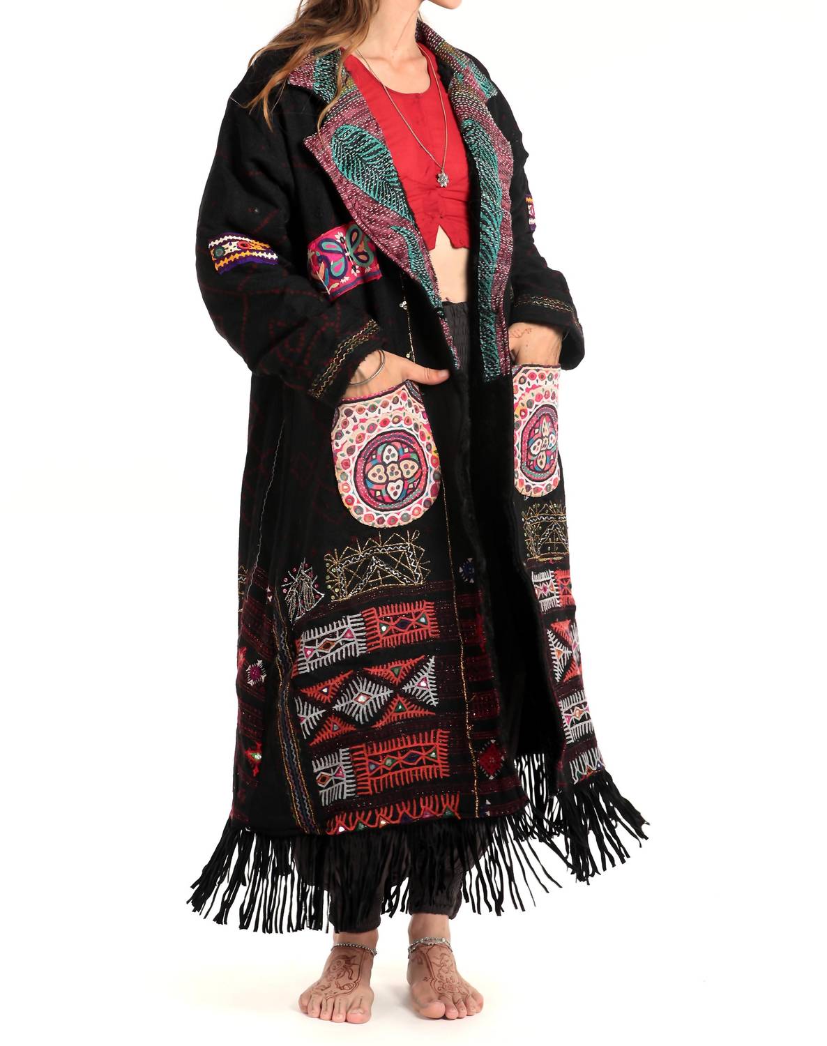 Discover the StandAwt Merino Wool Coat, a vibrant piece in striking black, red, and green that embodies Boho Chic style. With long sleeves and patterned details, this trench coat is crafted from 100% merino wool and lined with faux fur for warmth. Featuring a button closure, silk collar, hand-embroidered patches, leather fringe, and tassel accents, it includes practical SA Signature patch pockets, a secret pocket, and is reversible for versatile styling. Care is simple: hand wash and lay flat to dry, making it not just a statement piece but also a sustainable choice for your vacation wardrobe.