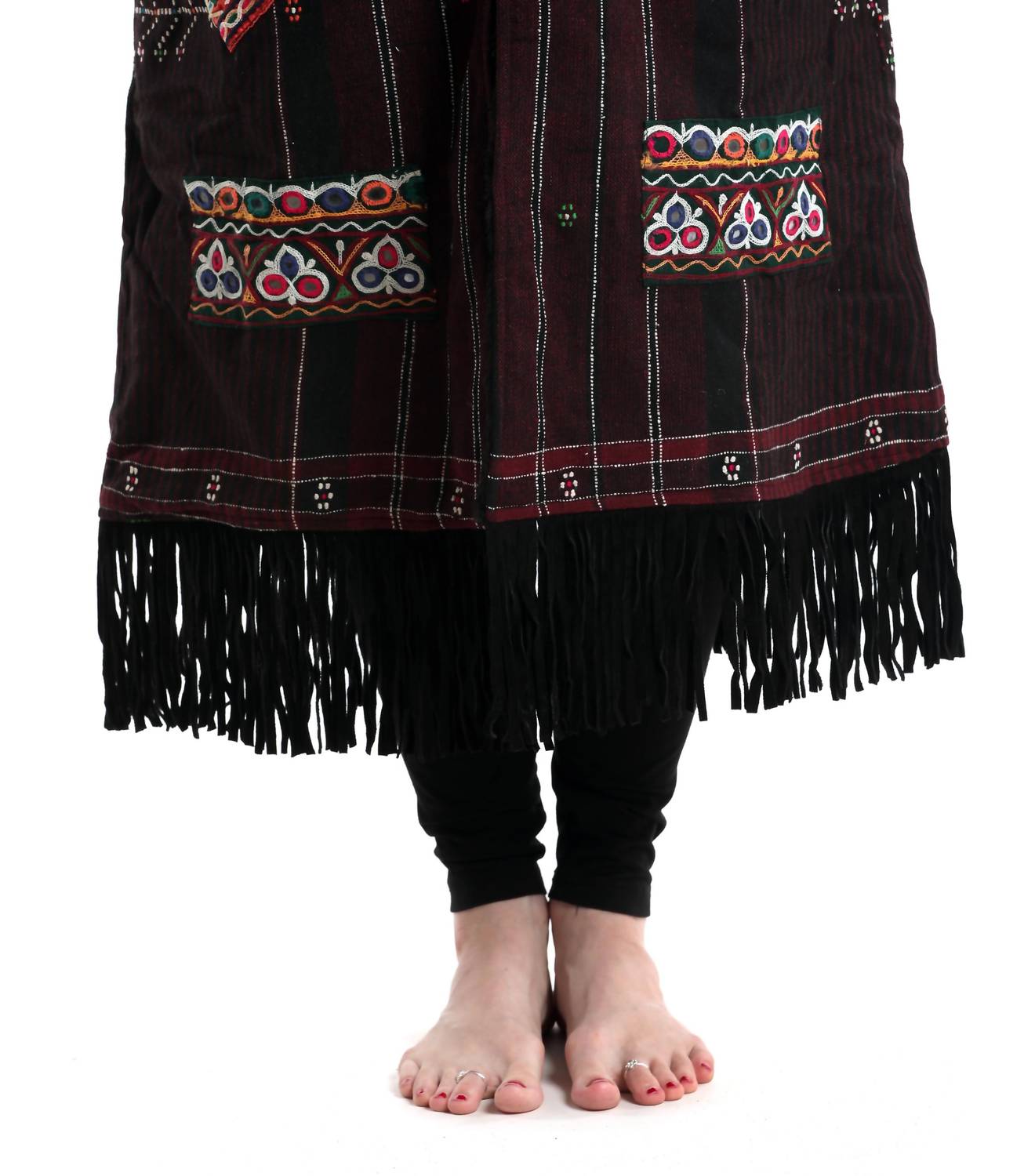 A jacket so versatile you can literally wear it with anything. Introducing the Maroon Merino Wool Kimono Coat by StandAwt, a statement piece perfect for making an impression. Crafted from 100% recycled merino wool with a faux fur lining for warmth, this long-sleeve, patterned coat is lined for extra comfort. It features a button closure and a silk collar, enhanced by hand-embroidered patches, a leather fringe, and tassels, making it ideal for a boho chic look. This rare, one-of-a-kind coat includes two large pockets and a secret pocket, emphasizing both style and functionality. Care: Hand wash and lay flat to dry.