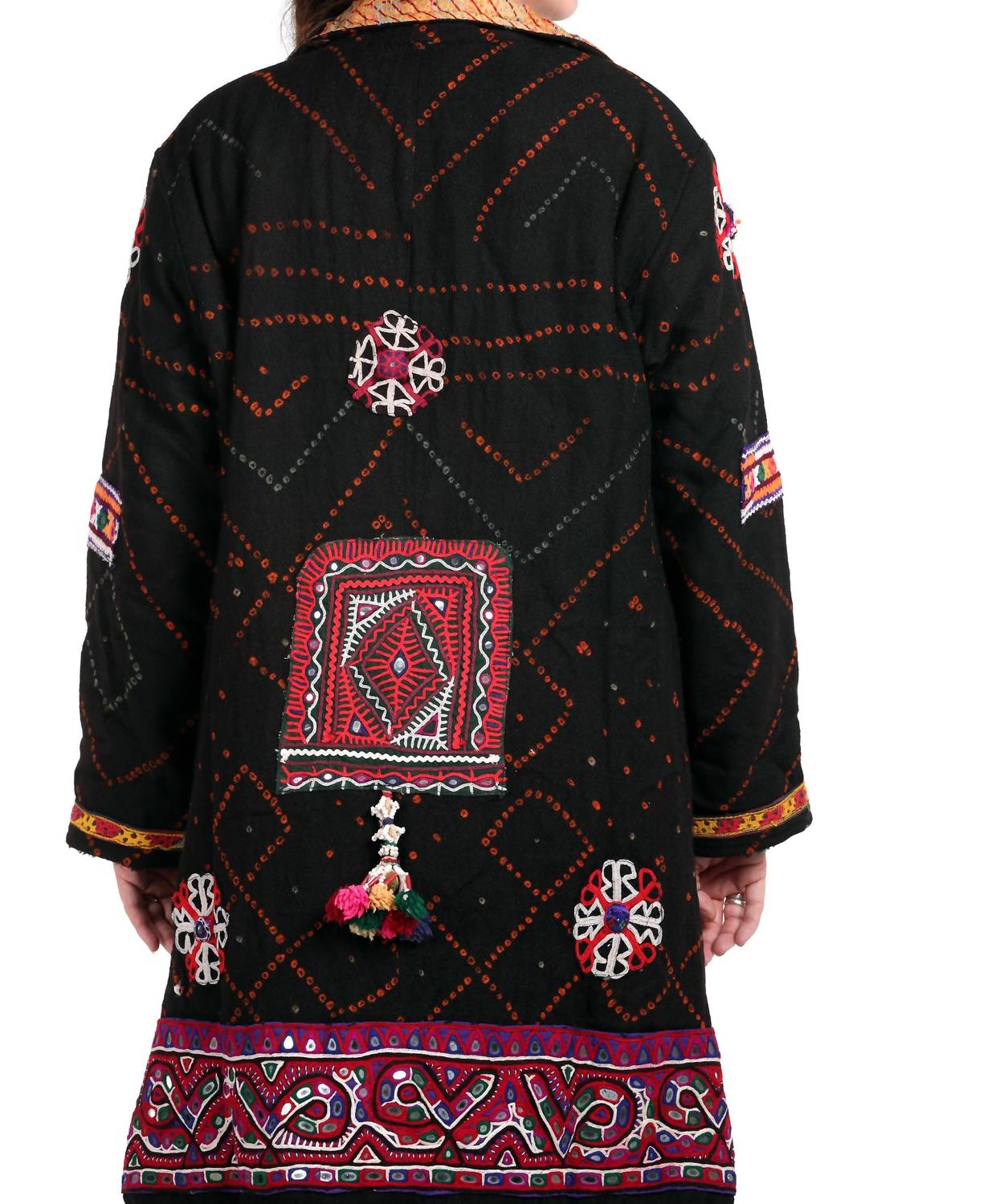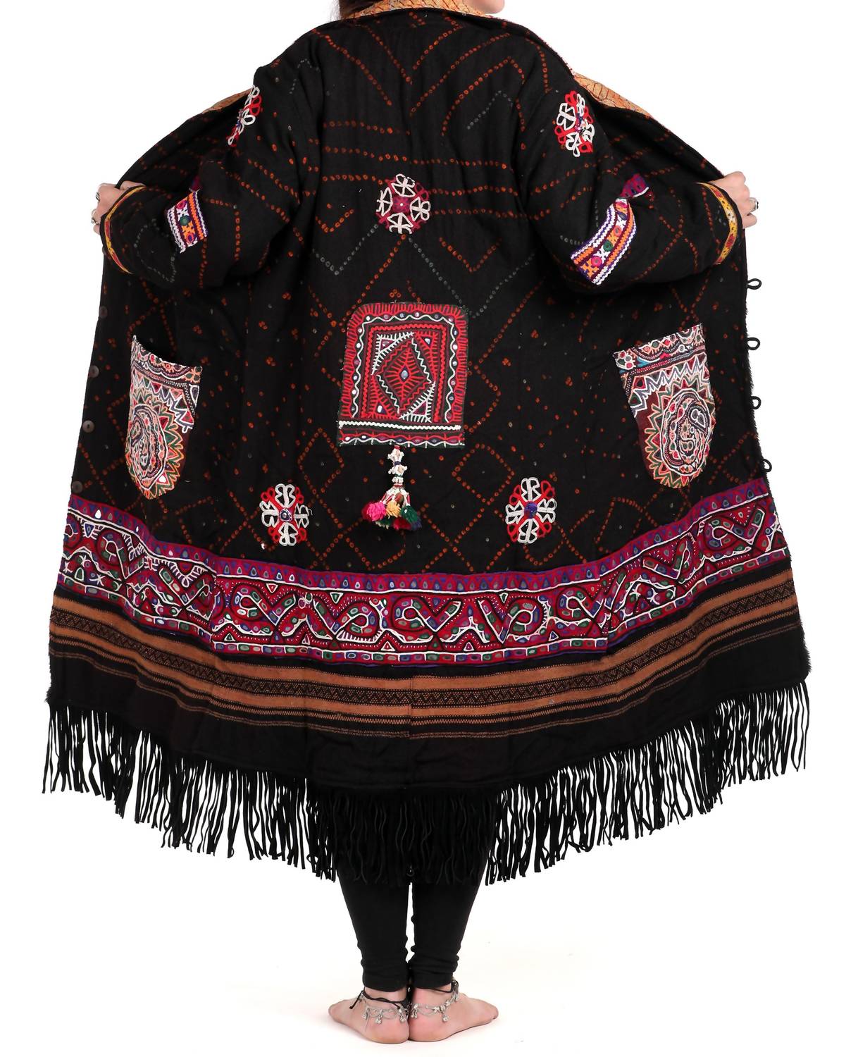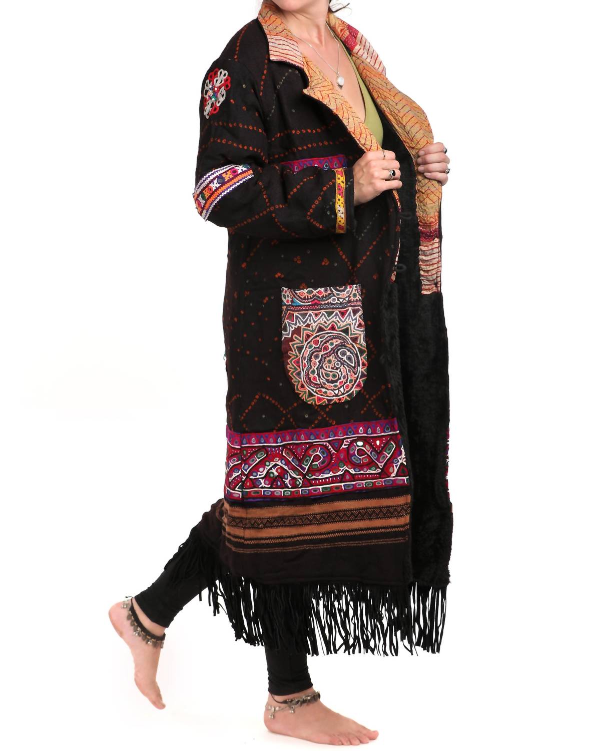 Introducing StandAwt's Rare Merino Wool Coat in striking black and purple, a must-have for your winter wardrobe. This long-sleeve, patterned piece is meticulously crafted from 100% merino wool, featuring a faux fur lining for incredible warmth and comfort. The coat, standing 47 inches long with fringe, is further enhanced by a silk collar and unique hand-embroidered patches. Designed with practicality in mind, it offers SA Signature Patch Pockets, a secret pocket, and a button closure for versatile wear. Care for it by hand washing and laying flat to dry, ensuring its longevity.