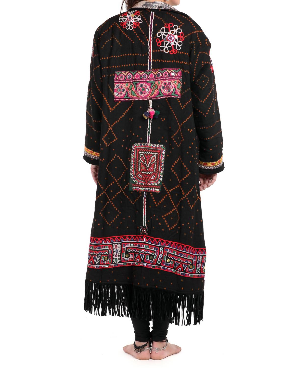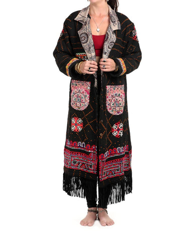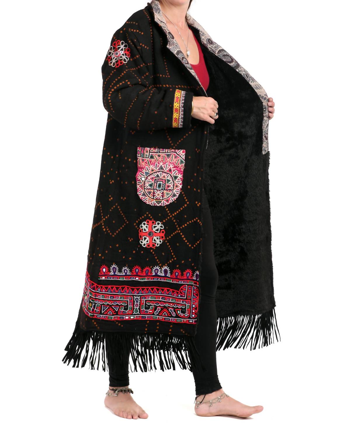 Cute, casual, and comfortable. This jacket is a must have. Introducing StandAwt's Rare Merino Wool Coat, a boho chic statement piece perfect for those who love bold fashion. This long sleeve jacket features a unique patterned design with a silk collar, leather fringe, and tassels, and is made from 100% merino wool with a luxurious faux fur lining for ultimate warmth. It boasts the practicality of SA Signature Patch Pockets and an inner secret pocket, with the convenience of a button closure.