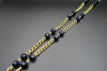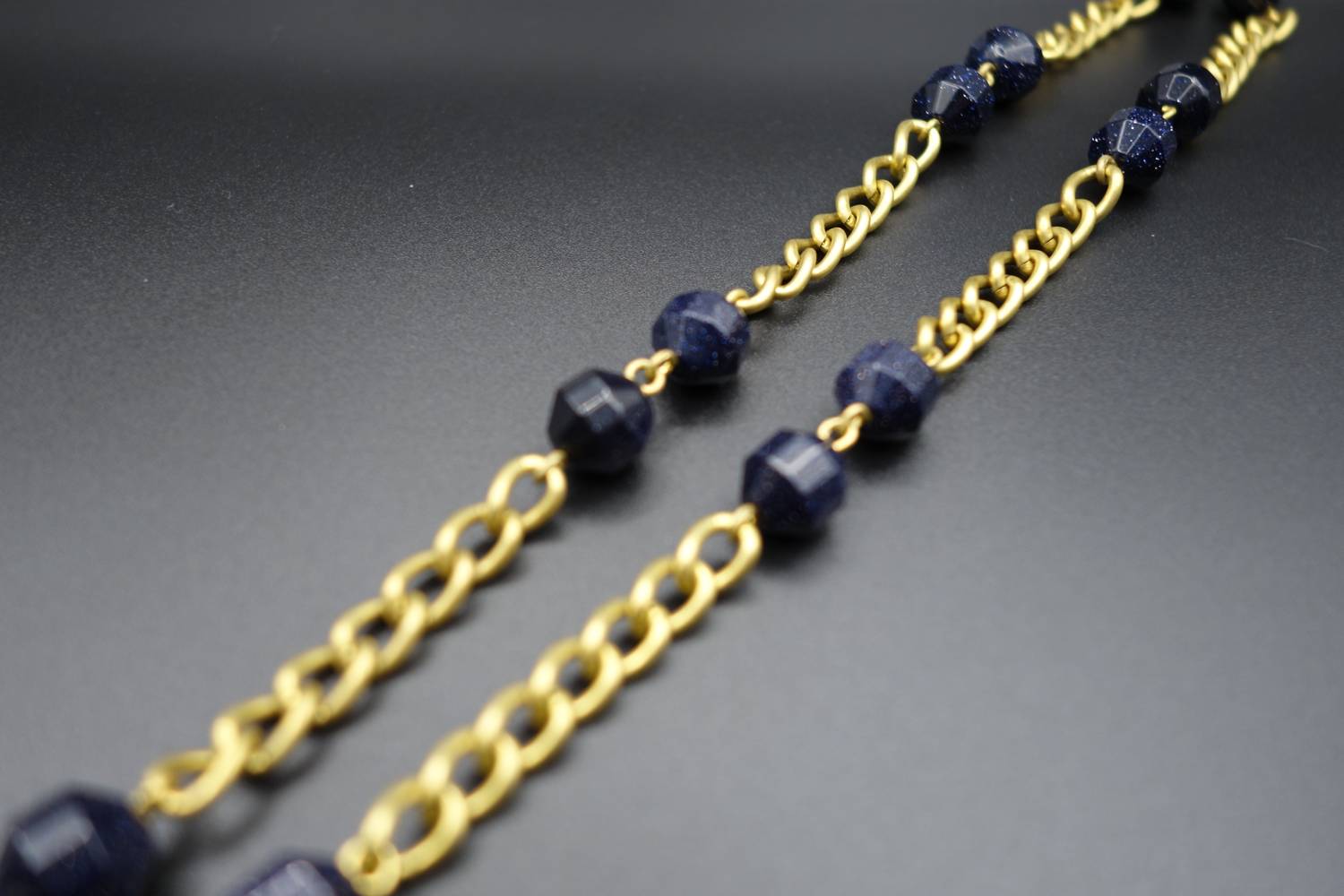 Enhance your eyewear with the Women's Celestial Sunglasses Chain by StandAwt, a unique piece featuring dark blue celestial diamond-shaped beads. This versatile brass chain, measuring 30 inches, can serve as a sunglasses chain, eyeglasses holder, necklace, body chain, or even a mask securer. Crafted from natural gold-toned brass, it gains a charming vintage look over time. It includes two lobster clasps and rubber bands for easy attachment.