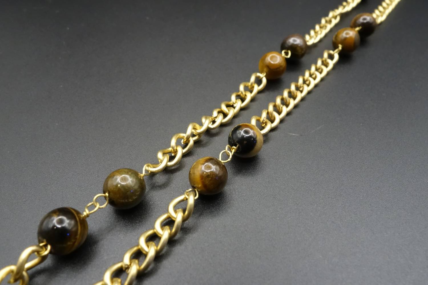 Blending fashion and practicality, these stylish shades are chic and mandatory. Stand out from the crowd and safeguard your vision with these stand-out sunglasses. Enhance your accessory collection with the Women's Tiger Sunglasses Chain by StandAwt, a versatile piece in a timeless gold brass finish. Measuring 30 inches, this chain features elegant tiger eye gemstones, known for their associations with courage and protection, along with rubber bands and elastic connectors. The unpolished brass lends a vintage touch that will age gracefully, allowing you to use it as a sunglasses chain, eyeglasses holder, necklace, or mask holder.