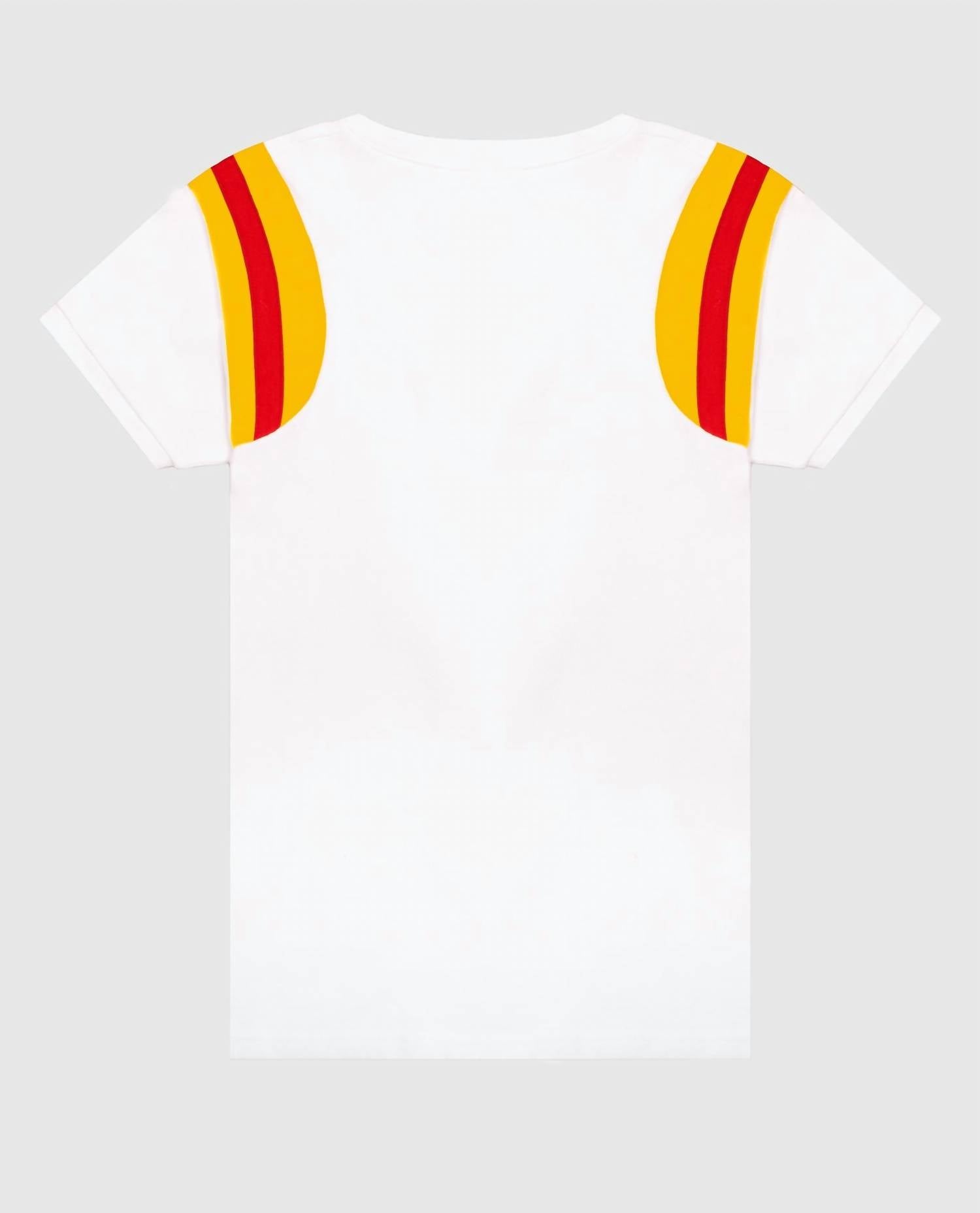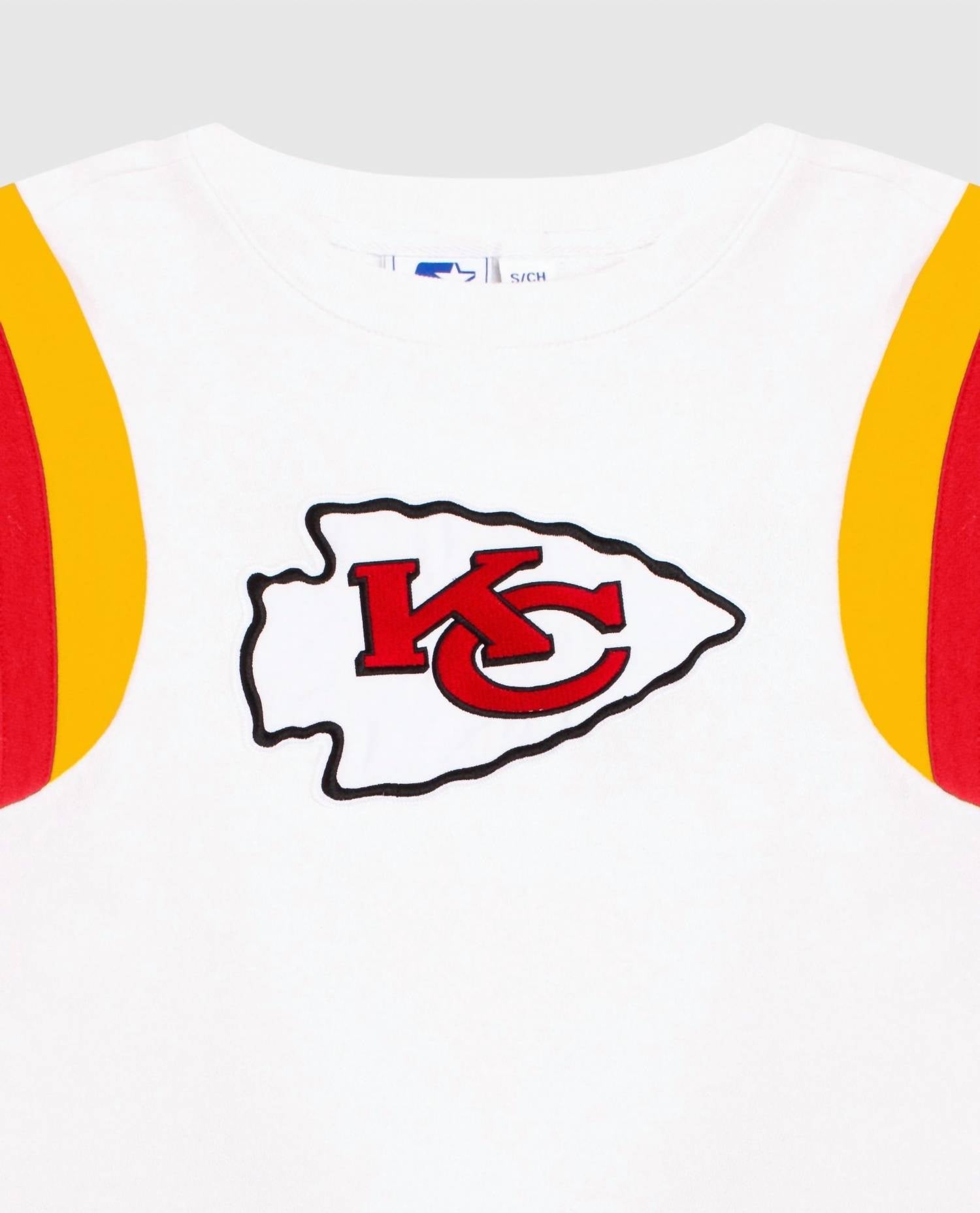 Cheer on your team with the Women's Kansas City Chiefs Short Sleeve Crew Neck Shirt by Starter, featuring a solid white body accented by bold primary and secondary color stripes on the shoulders. This short sleeve tee showcases a distinct team logo applique on the center chest and a Starter logo on the left cuff. Designed for easy wear, this shirt has a classic crewneck and pull-on closure. Perfect for showing your team spirit in style, it's a must-have for any fan's wardrobe.