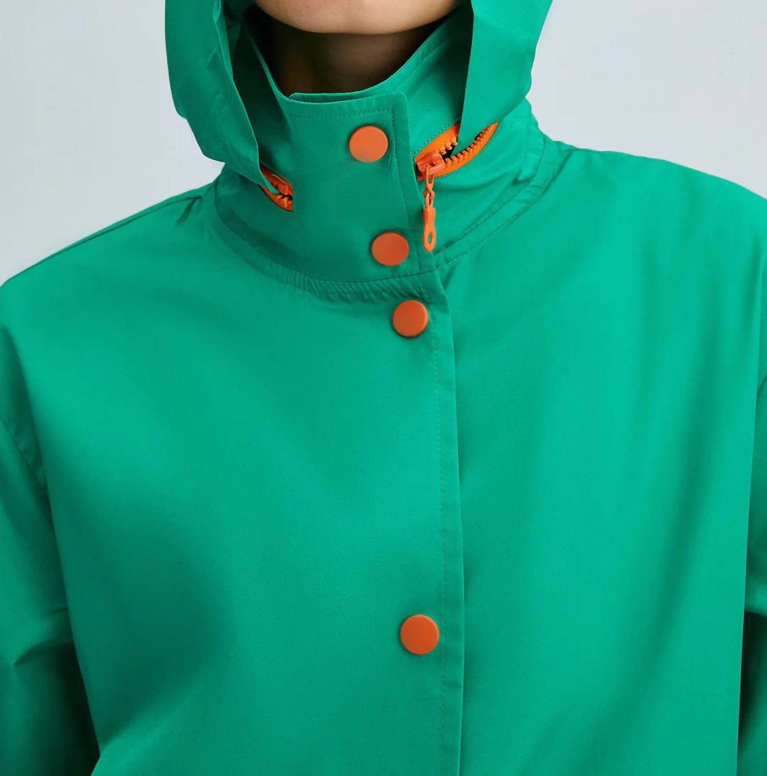 Introducing the Touché Privé Lucky Windbreaker Jacket, expertly crafted for a blend of modern style and practicality. This green, long-sleeve jacket is made from 100% polyester, featuring a hooded design and snap closure for added convenience. With its solid pattern and elasticated wrists, this piece promises both elegance and functionality. Perfect for women who appreciate a sporty yet fashionable look.
