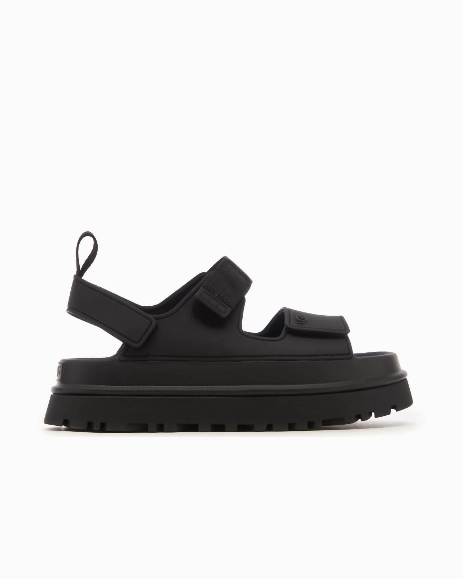 Step into summer with the Women's Goldenglow Sandal by UGG, designed for effortless style and comfort. This black platform sandal boasts a 2-inch platform height and a supportive sugarcane EVA outsole, making it as durable as it is fashionable. Featuring a TPU upper and an adjustable hook-and-loop closure, the sandal incorporates 100% recycled polyester fibers in its design. With a rubber sole and air circulation system, enjoy a preppy, eco-conscious look perfect for warm days.