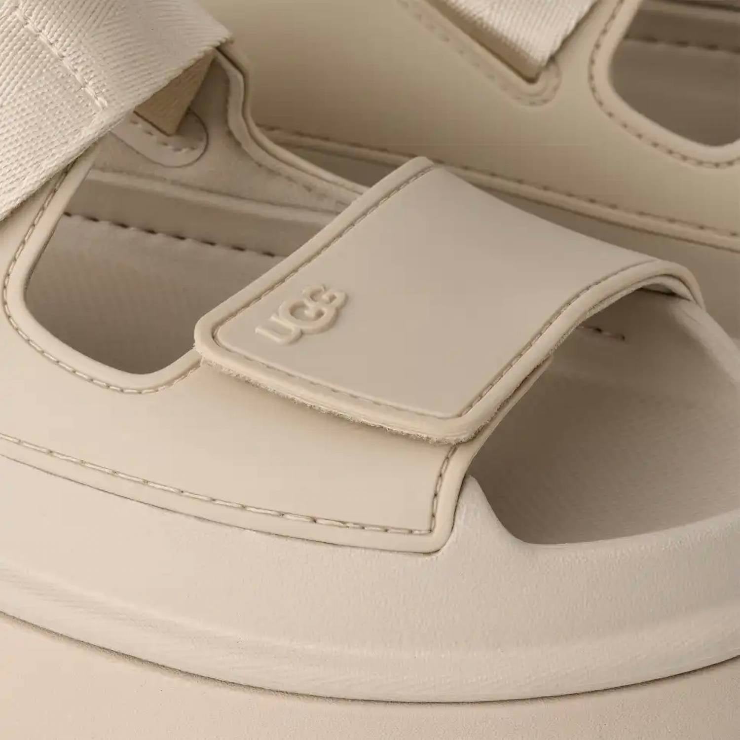 Step into summer style with the Women's Goldenglow Sandals by UGG in a refreshing Sea Salt color. Featuring an open toe and a chunky heel, these sandals are constructed with a TPU upper and lined with 100% recycled polyester fibers for sustainable flair. The springy sugarcane EVA midsole and outsole provide support and comfort, while the hook-and-loop closure ensures a customizable fit. Perfect for vacation or Easter outings, these sandals promise to be your lightweight, streetwear staple.