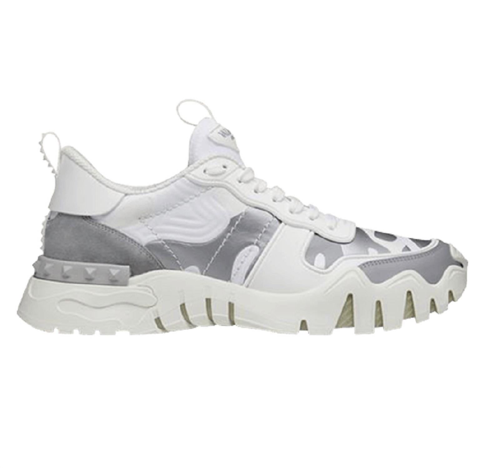 Discover the Men's Rockrunner Plus Sneaker by Valentino Garavani, a stylish addition to your footwear collection. Crafted with premium leather, these sneakers boast a striking camouflage pattern with white and silver accents. Designed in Italy, they feature a rubber sole for excellent grip and a cushioned interior for enhanced comfort. Ideal for spring, these sneakers have a flat heel under 1 inch and a round toe shape, perfect for both casual and chic outings.