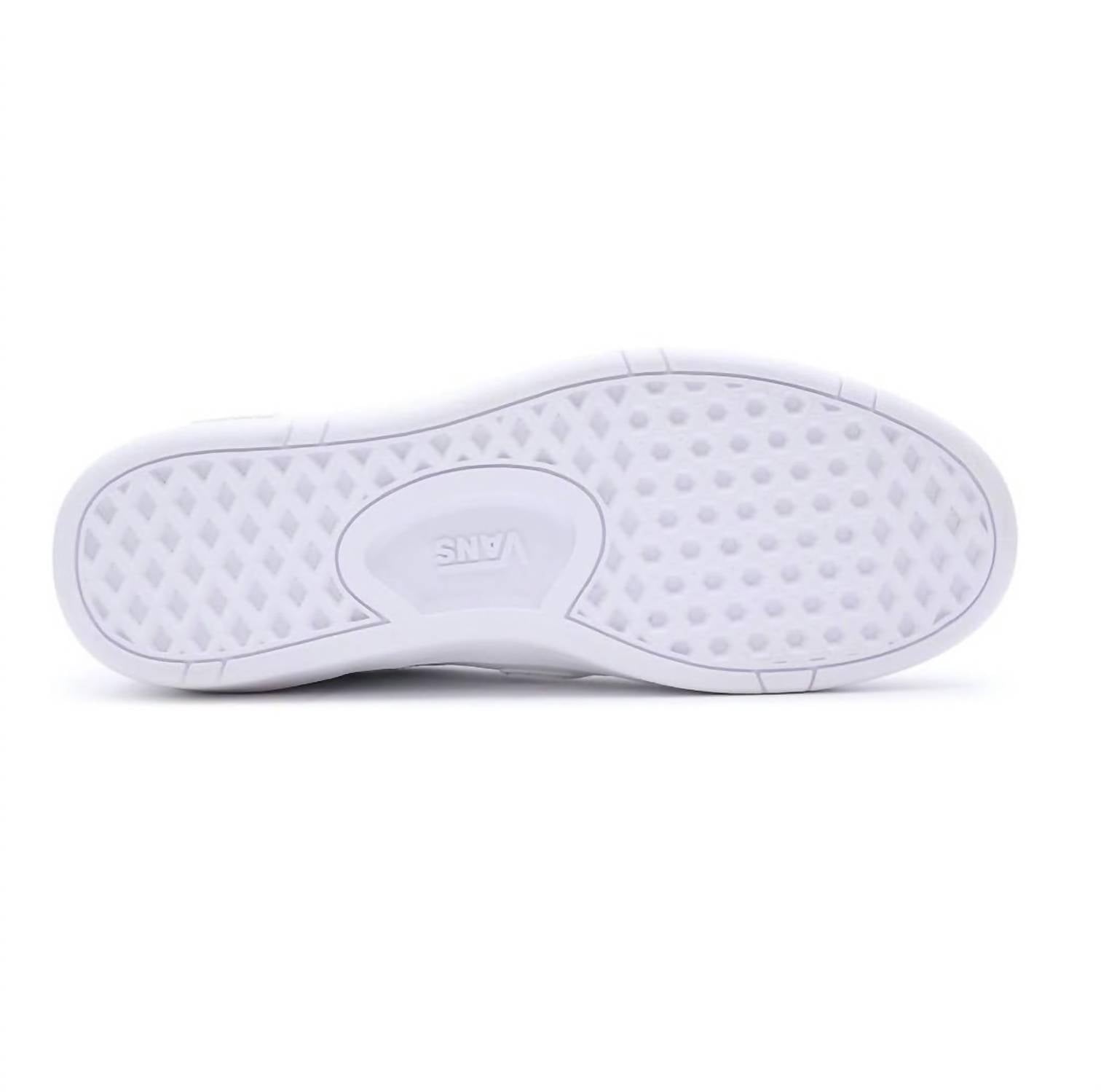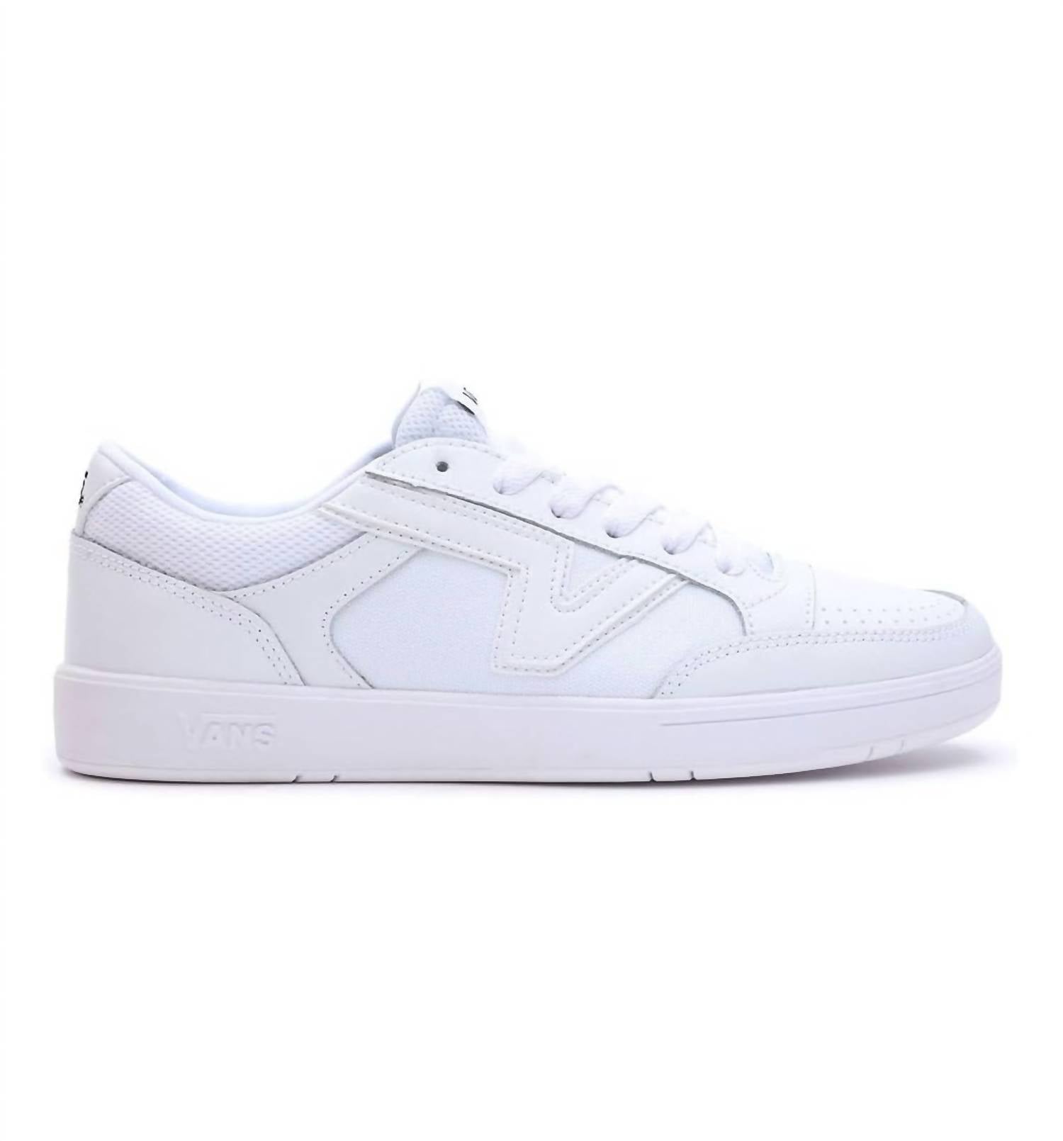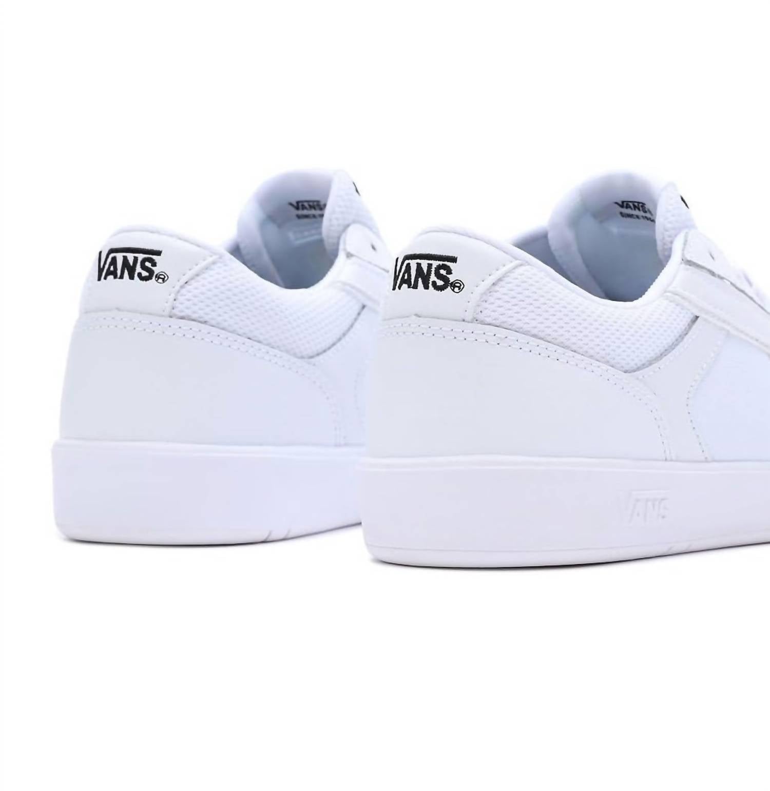 Experience the timeless charm of the Women's Lowland ComfyCush Leather Shoes by Vans, in an elegant True White hue. With a design inspired by Vans' archival 80s silhouette, these sneakers feature a low profile and a upper crafted from natural leather and synthetic materials. The shoes promise all-day comfort with their ComfyCush outsole and a padded collar, complemented by a classic rubber waffle sole. Perfect for those looking for a blend of retro style with modern comfort, the round toe and flat heel design make these sneakers a must-have.