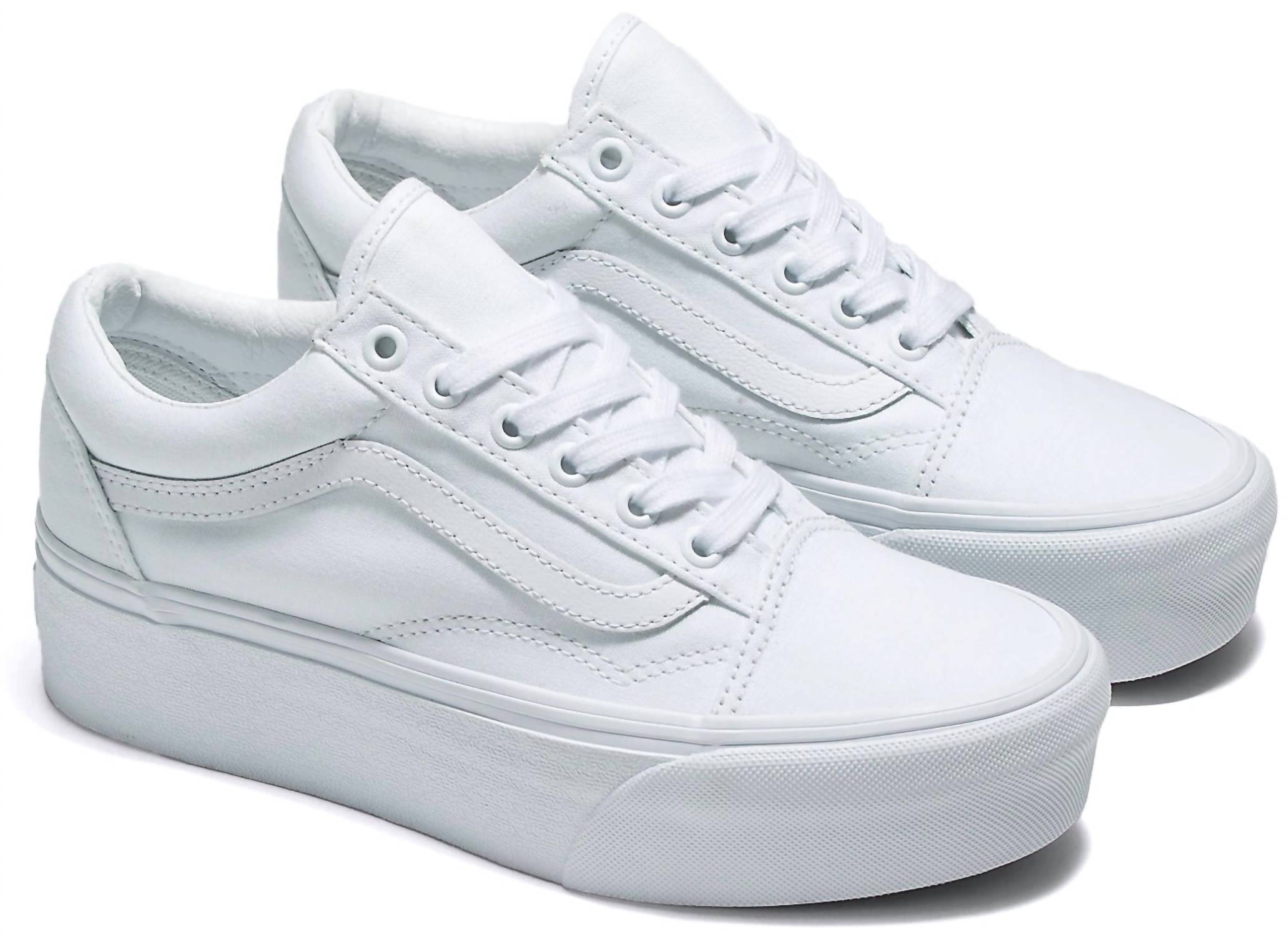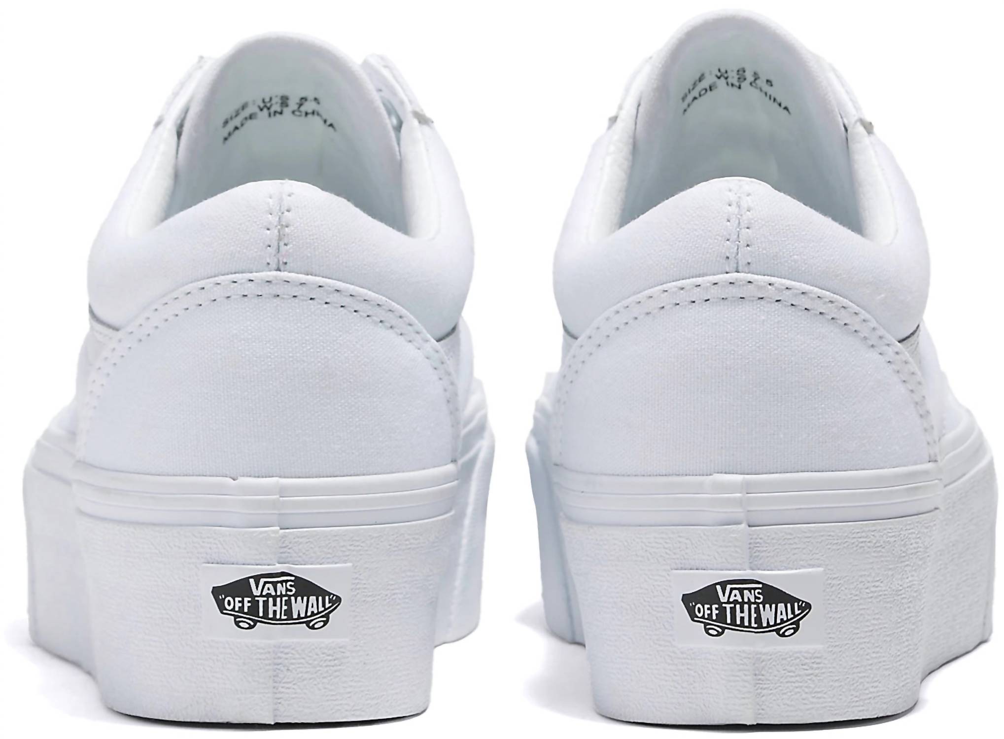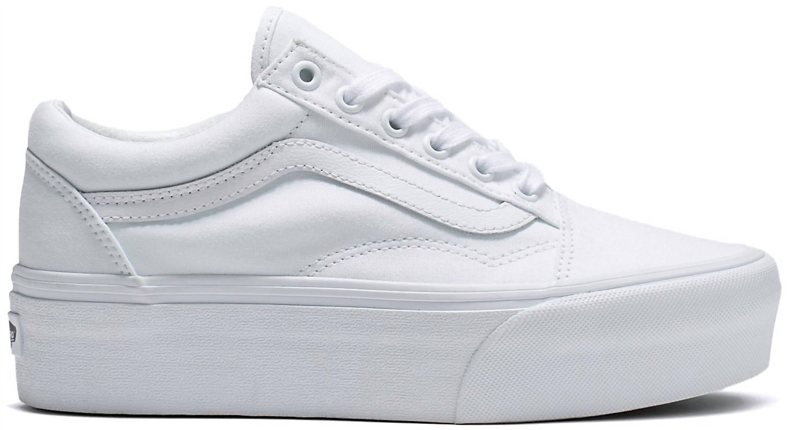 The Women's Old Skool Stackform Shoes by Vans, in an eye-catching True White, offer a bold twist on an iconic silhouette. Crafted with durable canvas and traditional suede uppers, this sneaker features a substantial 34 mm (1.33 inches) platform heel for a standout look. Designed with a lace-up closure, supportive padded collars, and signature rubber waffle outsoles, these sneakers blend classic style with contemporary edge. Perfectly suited for adult women, they provide both comfort and flair with a round toe and low platform heel height.