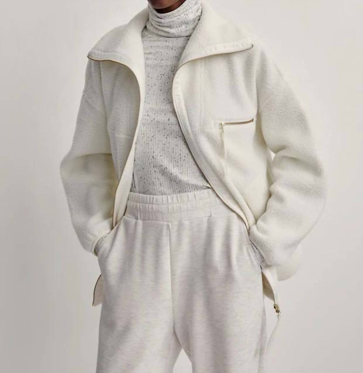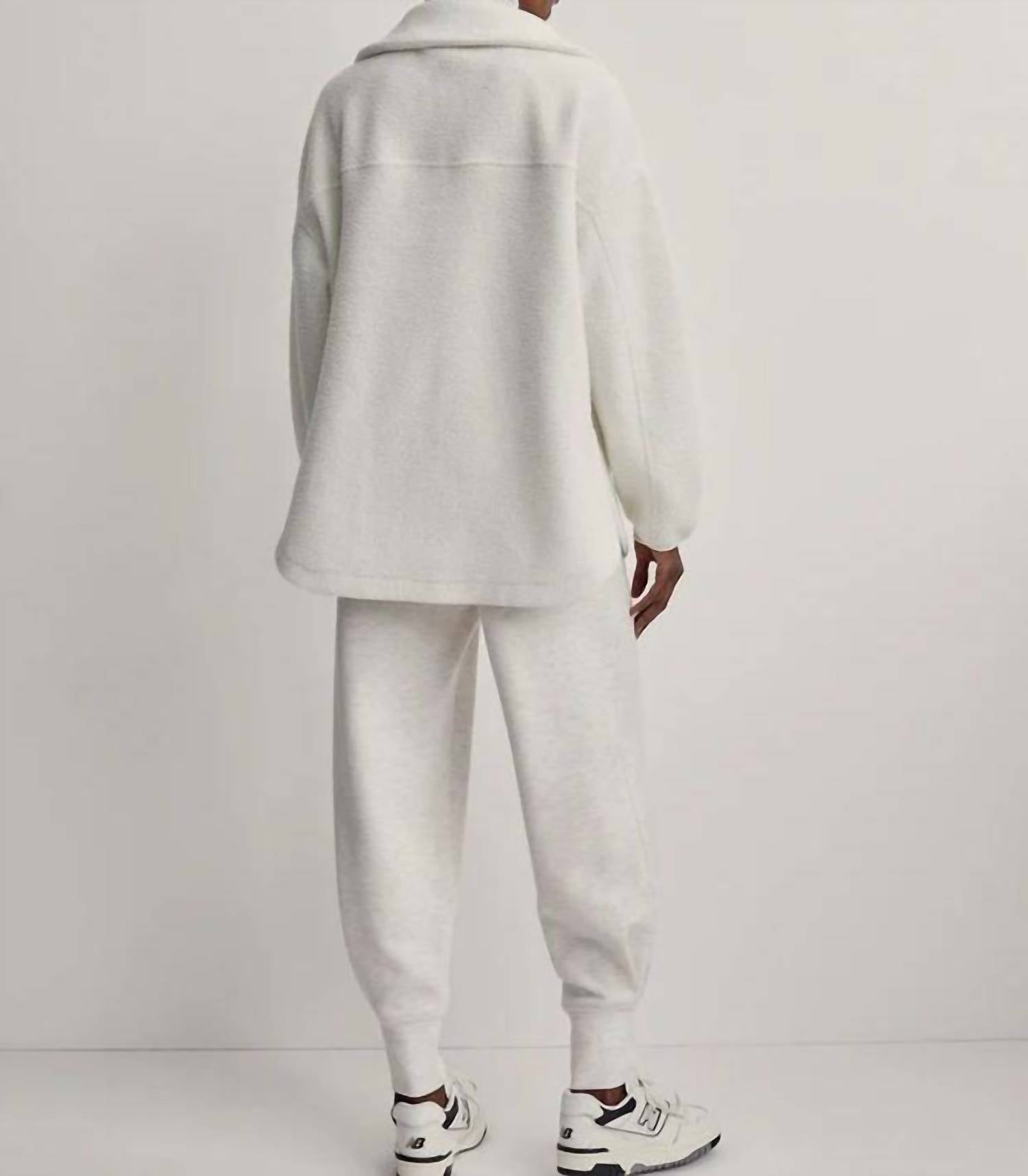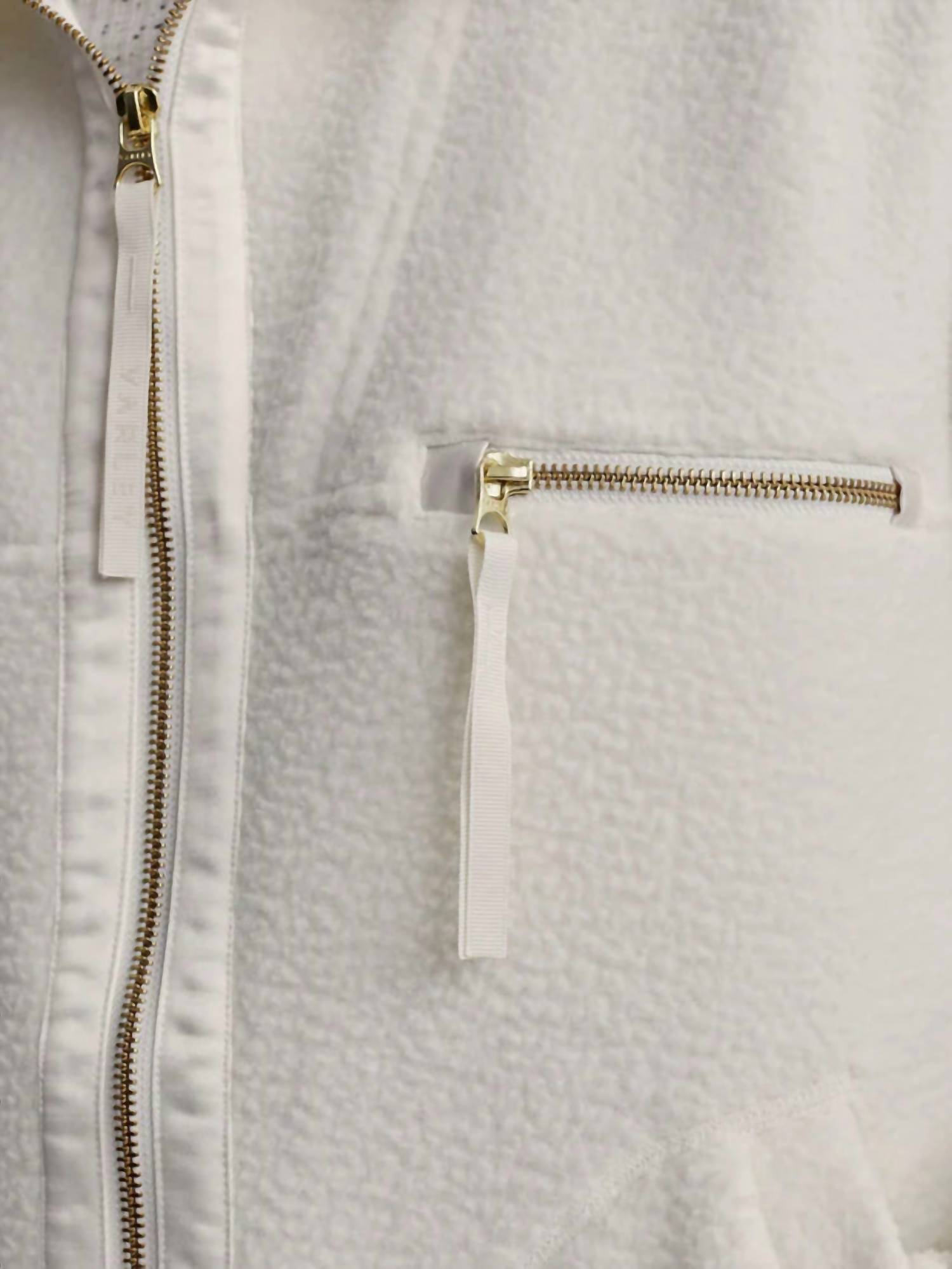 Introducing the Donley Fleece Jacket by VARLEY, an oversized piece designed for both warmth and style in a solid Egret color. With long sleeves and a feminine high collar, this jacket is crafted from 100% recycled polyester, featuring a plush Borg fleece for ultimate texture. Its zip closure and stepped hemline add versatility to your winter wardrobe, effortlessly blending casual elegance with "Quiet Luxury." Care is easy with machine wash cool instructions; just avoid bleach, tumble drying, ironing, or dry cleaning. The size small includes a front length of 28 inches and sleeve length of 19.7 inches.