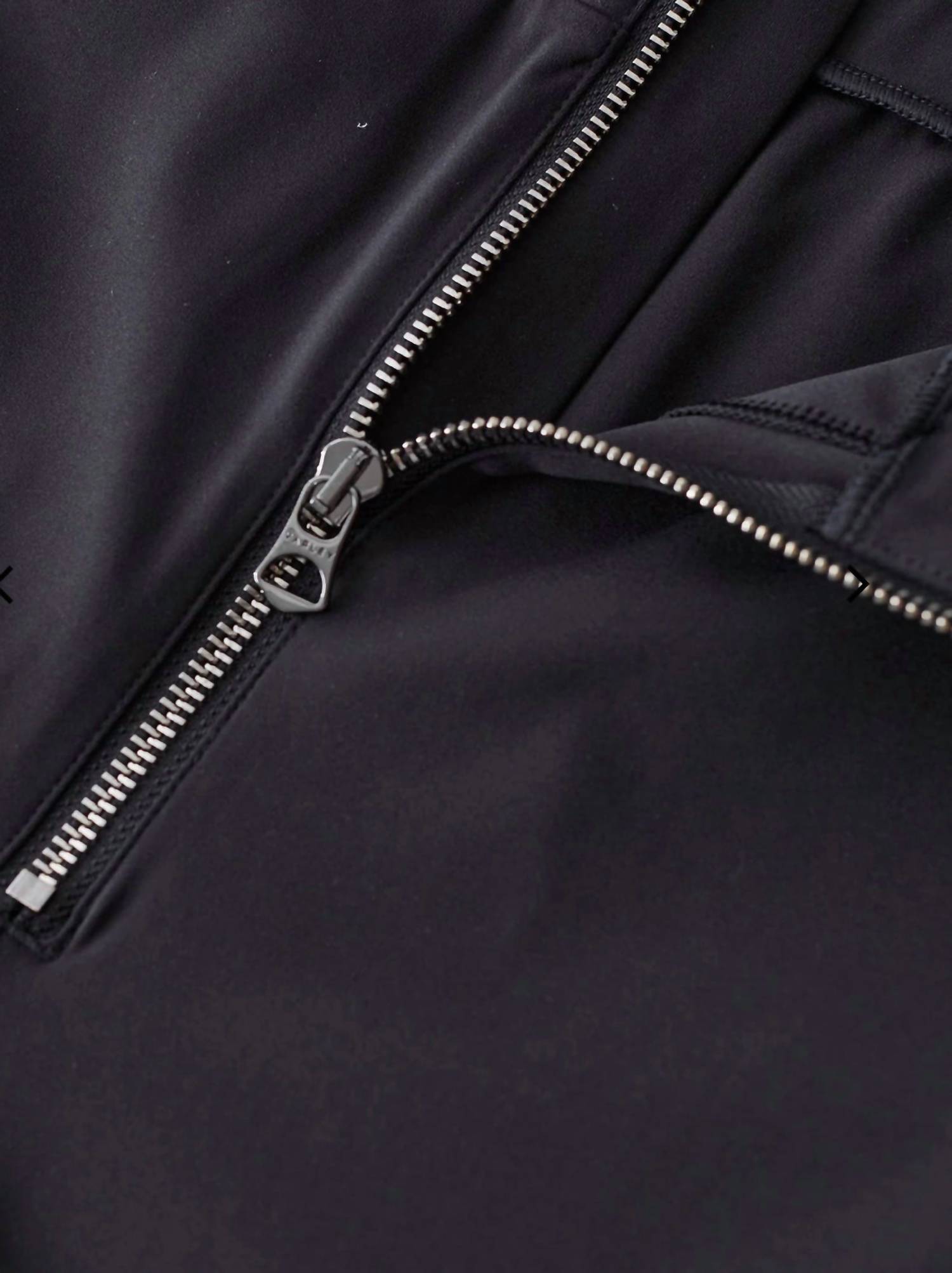 Slim-leg tailored pants with a high waist and elevated zip closure. Features 4-way stretch, breathability, sweat-wicking properties, and deep ankle cuffs. Includes side seam and back welt pockets for essentials. 62% polyamide, 38% elastane. Machine wash cool with similar colors. Do not bleach, tumble dry, iron, or dry clean. Remove promptly from washer and fasten zips before washing.