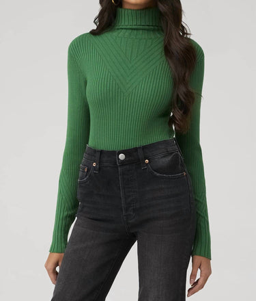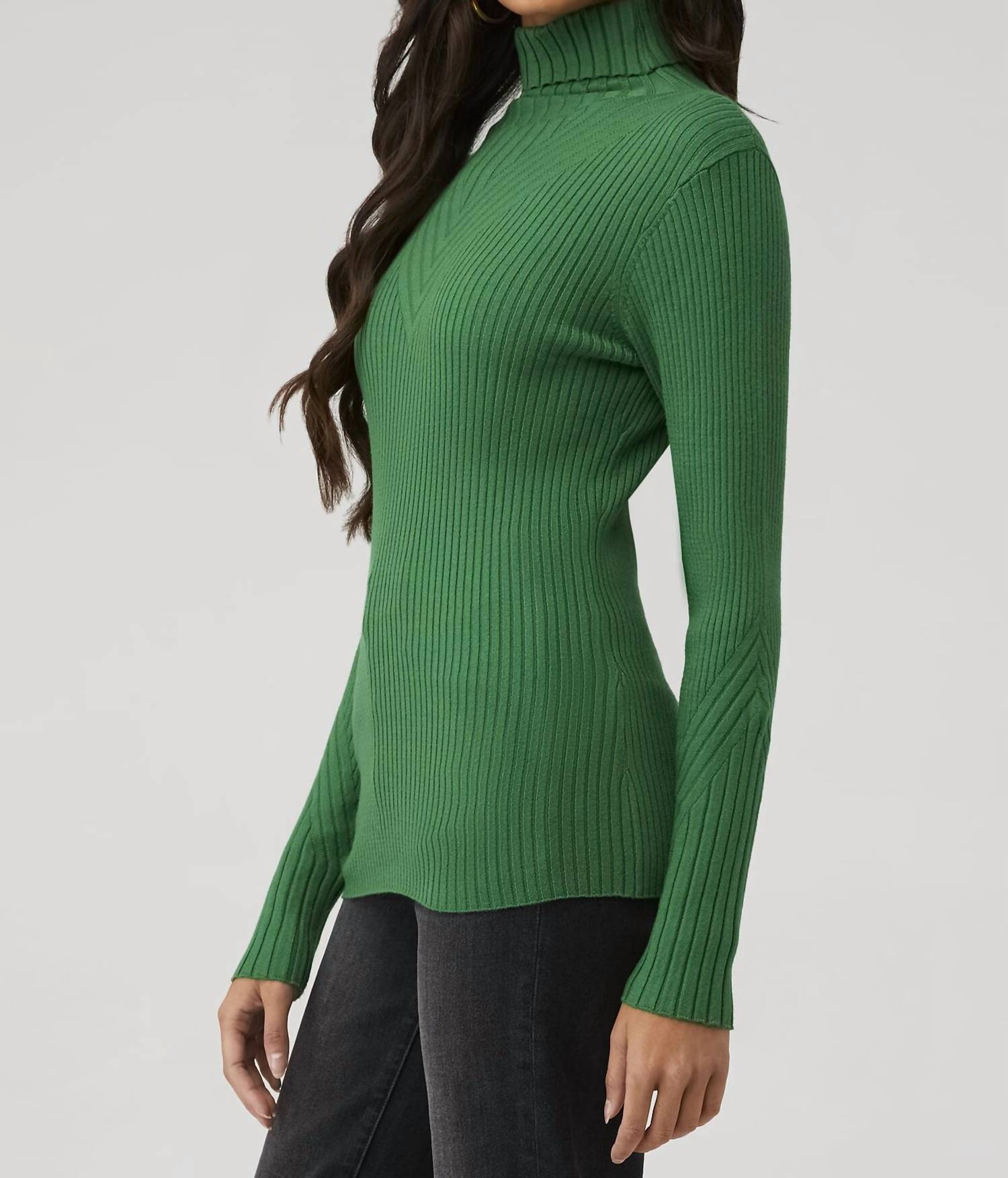 Meet the Esme Roll Rib Neck Sweater by VARLEY, a sophisticated addition to your collection in captivating Verdant Green. This women's sweater is designed with long sleeves and a classic turtleneck silhouette, offering a textured look that complements any ensemble. Crafted from a viscose blend of 44% Viscose, 28% Nylon, and 28% Polyester, it gracefully falls just below the waist. Closure: Pull-on style.