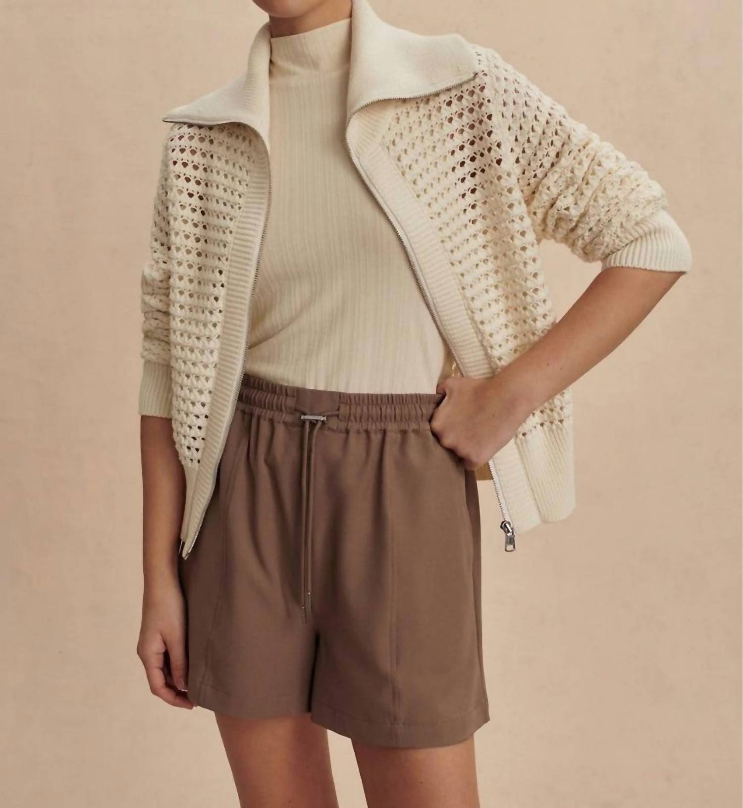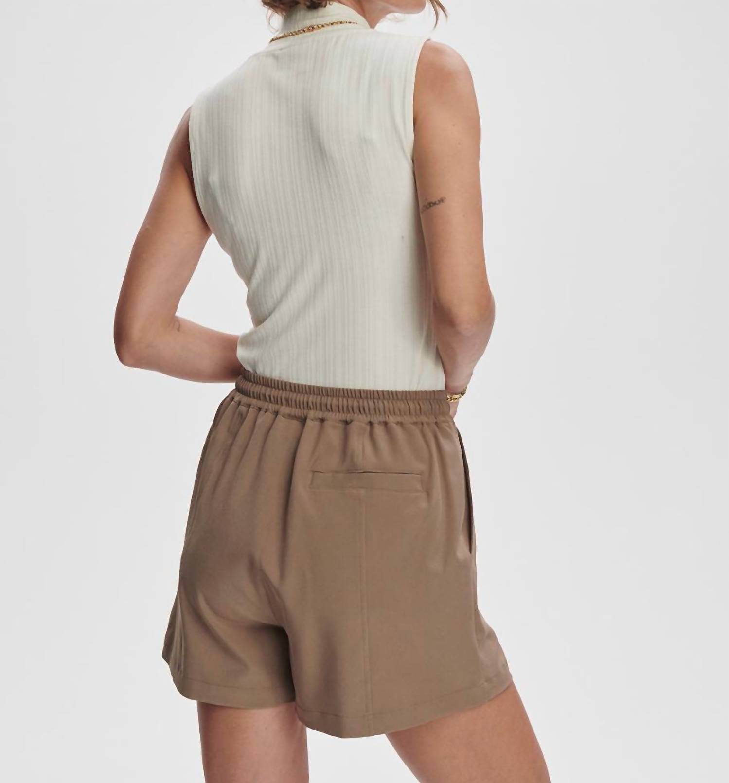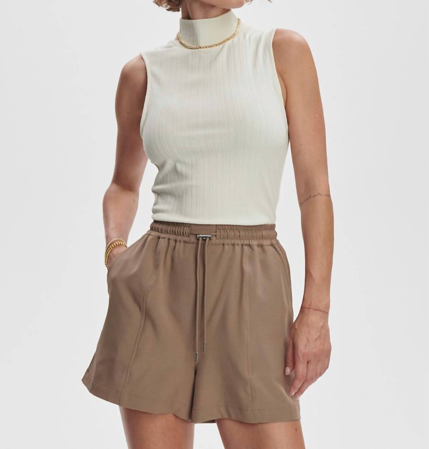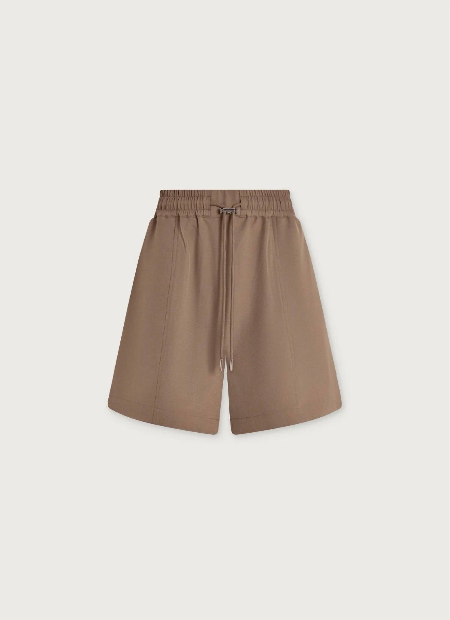 Introducing the Esmond Mid Rise Short by VARLEY, a stylish staple in a sophisticated Taupe Stone hue. Crafted from 94% Polyester and 6% Elastane, these high-waist shorts are designed to offer comfort and mobility with a solid pattern and functional pockets. Closure: Tie Closure. Care: Machine wash for easy maintenance. Perfect for any wardrobe, these shorts blend fashion and function effortlessly.