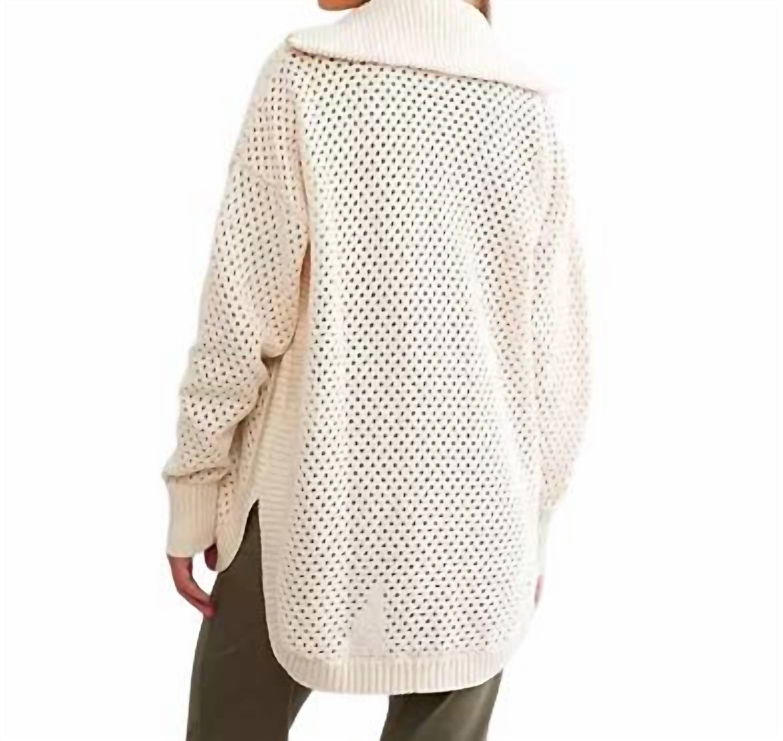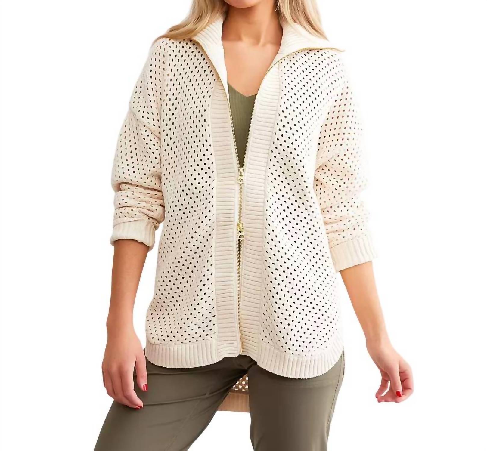Long sleeve, open stitch casual jacket is designed in 100% cotton, providing a breezy sheer effect perfect for layering. It features a zip closure with a high low hem, ensuring versatility and style all year round. Measurements include a bust width of 42" and a body length of 25" on a size small. Care instructions recommend machine washing cold.