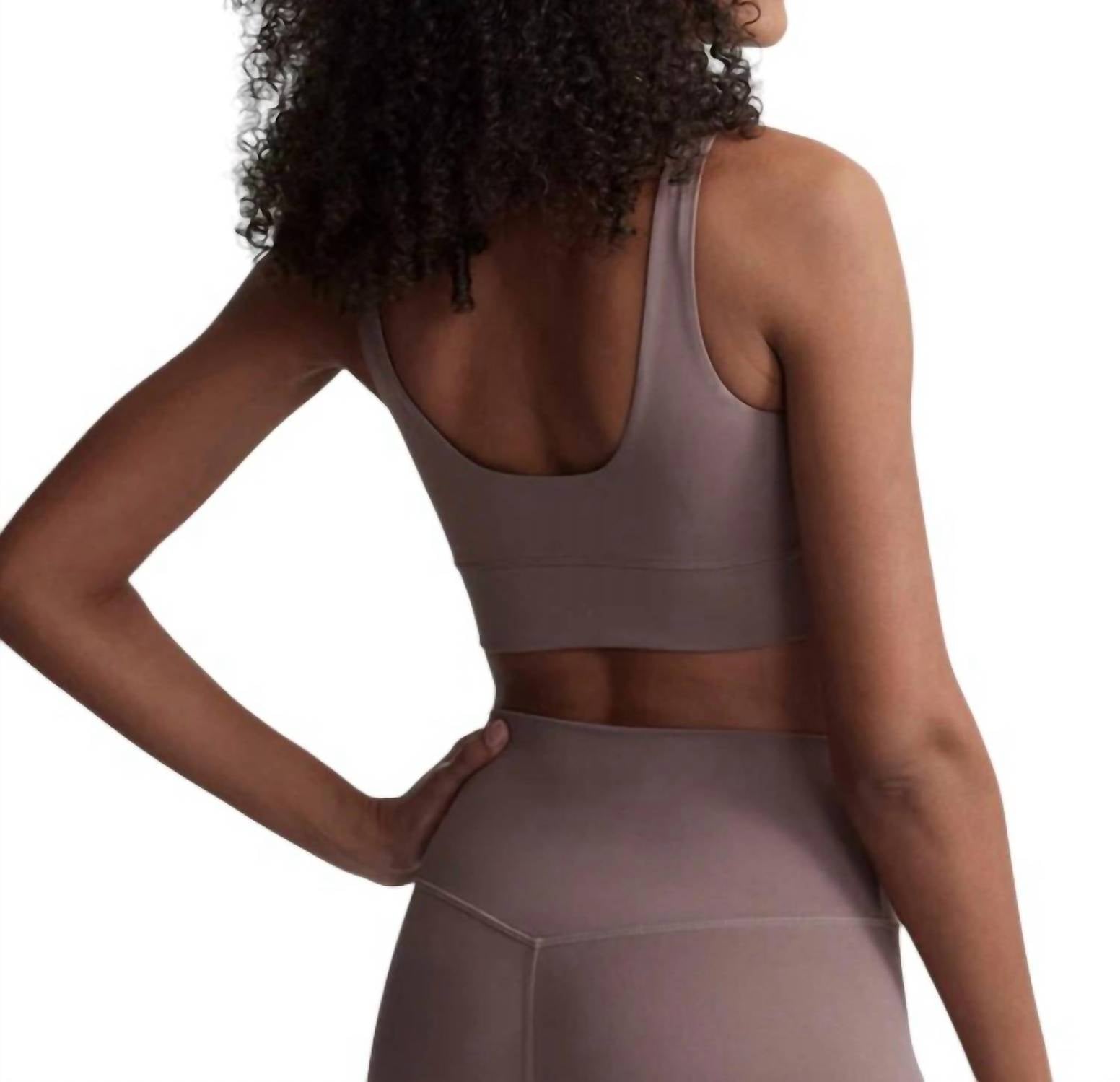 This sports bra is soft yet compressive with removable cups, wide armholes, thick straps, and a low back. The main fabric is 75% polyester and 25% elastane, with a lining of 92% nylon and 8% elastane. Machine wash cool.