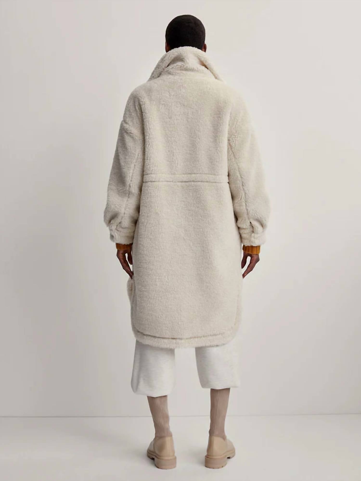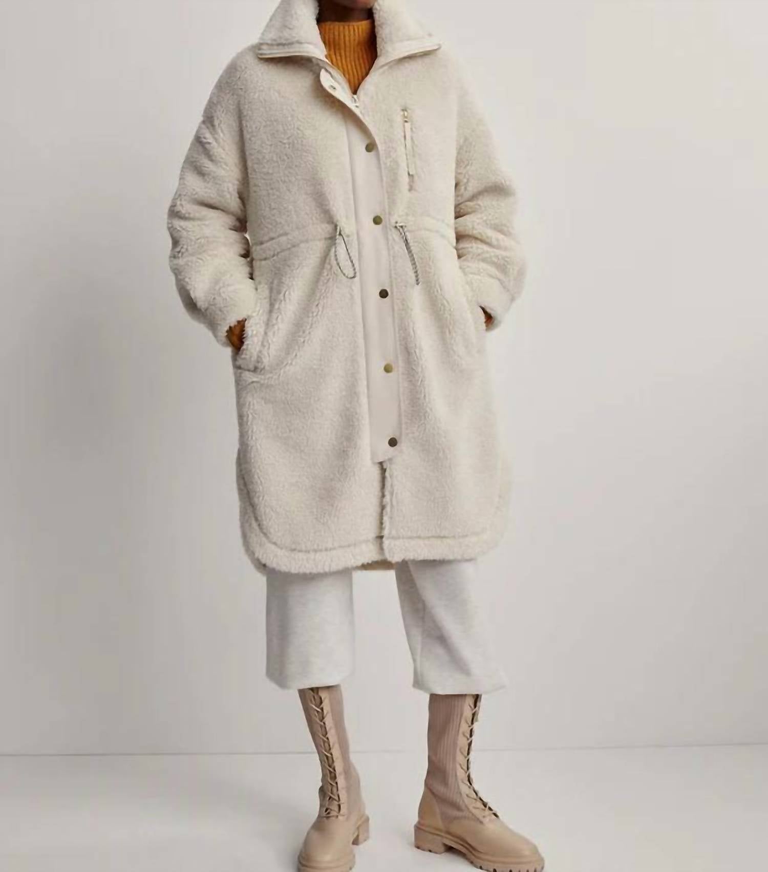 Introducing the Jones Coat by VARLEY, a statement piece in Sandshell designed to elevate your winter wardrobe. This long sleeve coat is crafted from cozy polyester Sherpa fabric, featuring a twill placket, dipped hems, and an adjustable waist with custom toggles for added warmth. Perfect for layering, it offers an oversized fit with functional pockets and a practical zip closure. Care: Machine wash.