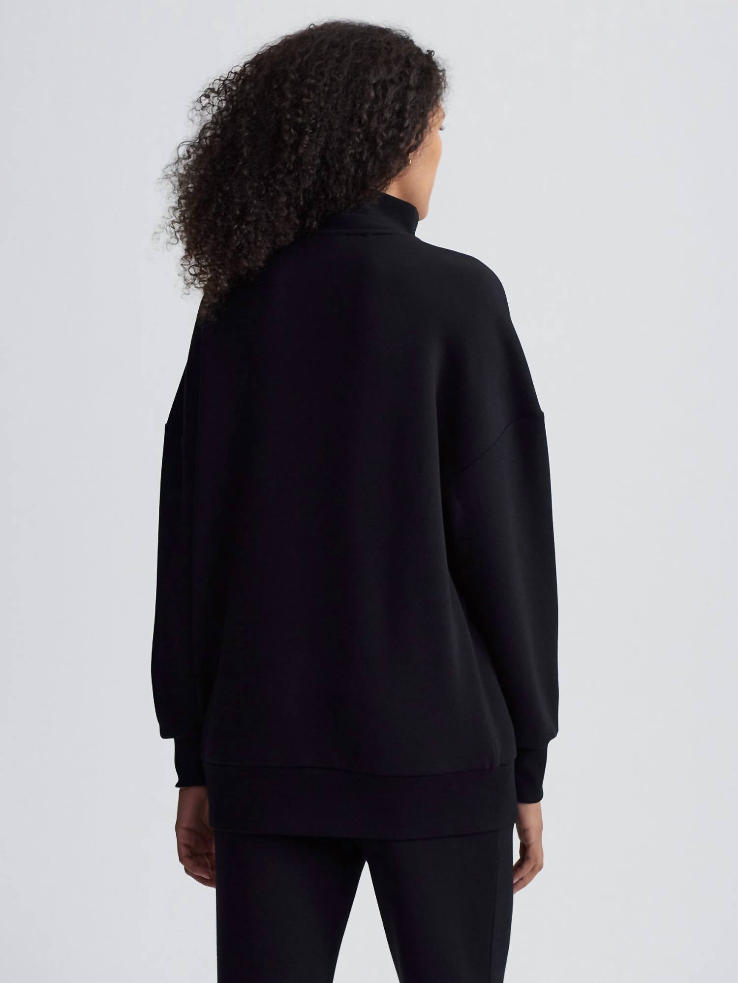 The Masie Longline Sweatshirt by VARLEY combines style and comfort in its sleek black design. Crafted from a Viscose Blend, this sweatshirt features a long sleeve and mockneck for a modern touch. Complete with a zip closure, it ensures easy wear, while the longline fit adds a stylish edge. Care instructions include machine wash and lay flat to dry. Size S dimensions are a front length of 28" and a sleeve length of 18.9".
