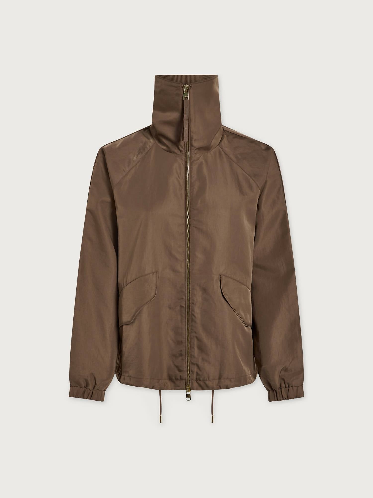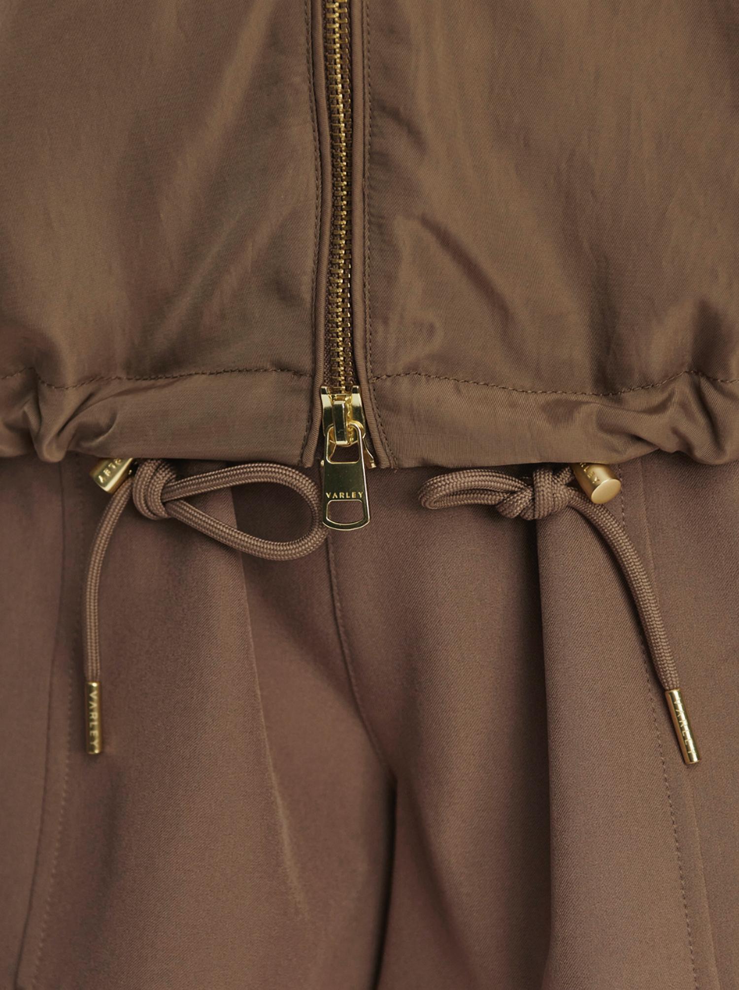 Meet the Morven Blouson Jacket by VARLEY, a chic utility jacket in sophisticated Taupe Stone. Designed for women, this solid-patterned jacket features long sleeves and a classic collar, perfect for both style and function. It's crafted from 100% Nylon with a practical zip closure and handy pockets. Originating from durable materials, it offers machine washable convenience, requiring cool care and avoiding bleach, tumble dry, or dry cleaning.