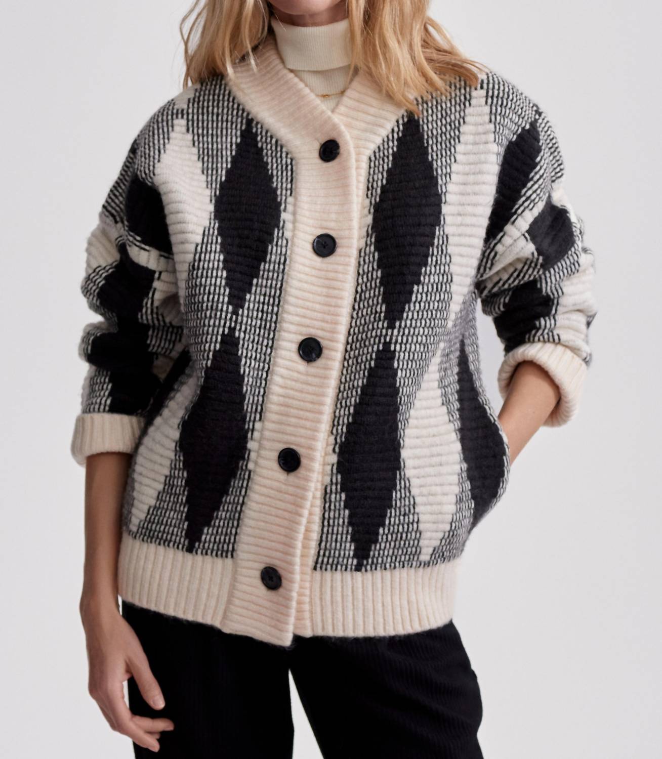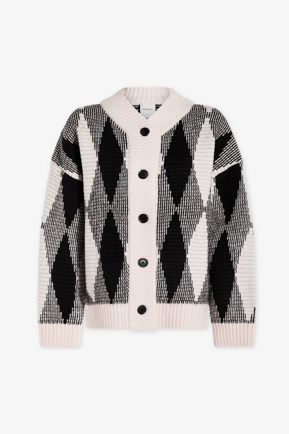 Introducing the Varley Nancy Jacquard Knit Jacket, a stylish and warm choice for the winter season. Featuring a striking diamond jacquard design, this casual jacket is crafted from a nylon blend composed of 57% acrylic, 40% nylon, and 3% wool. With a chic button closure and designed for an oversized fit, it measures 25.1 inches at the front length with 18.5-inch long sleeves. Care instructions recommend turning it inside out before washing or opting for a delicate dry clean.