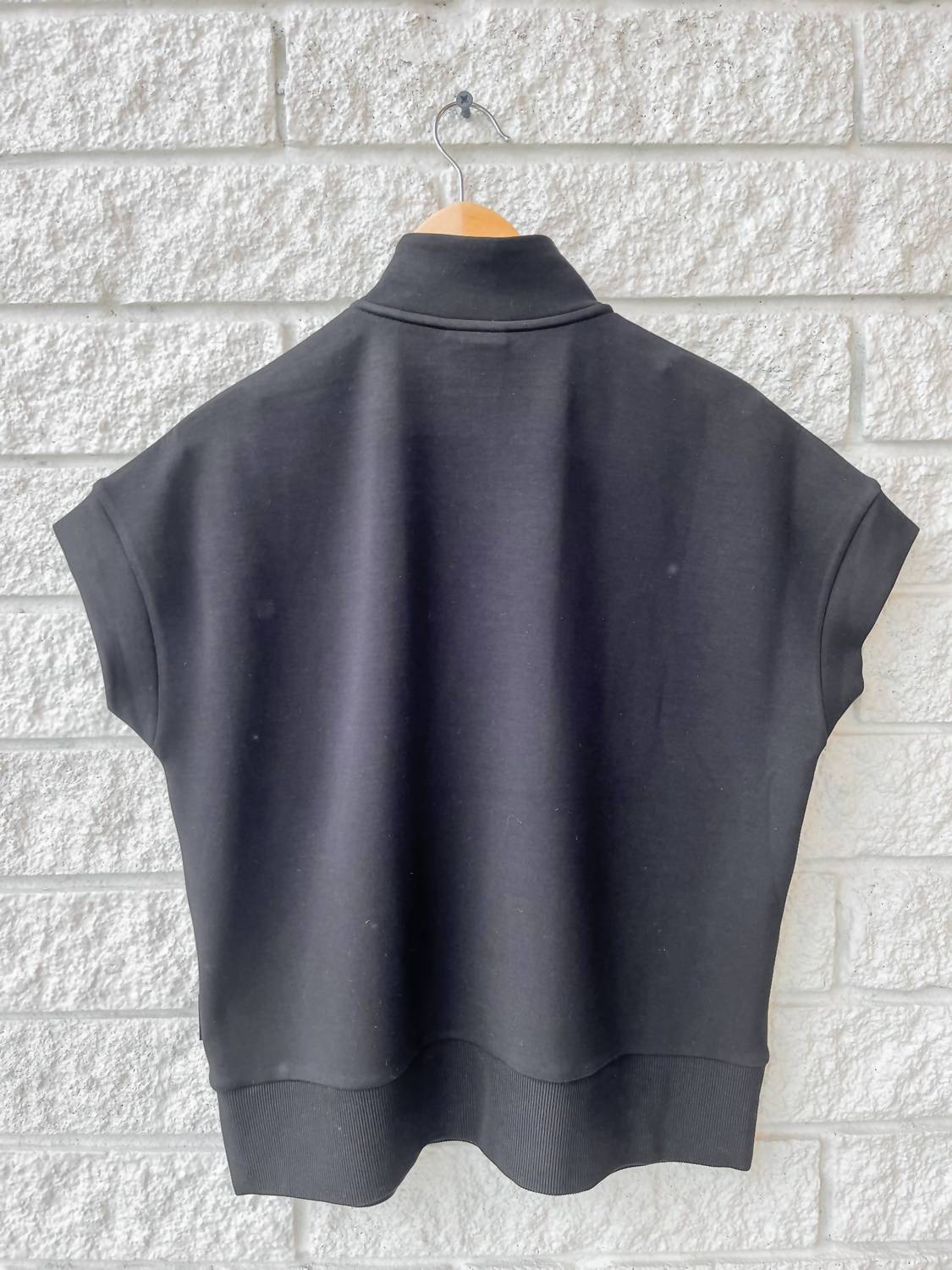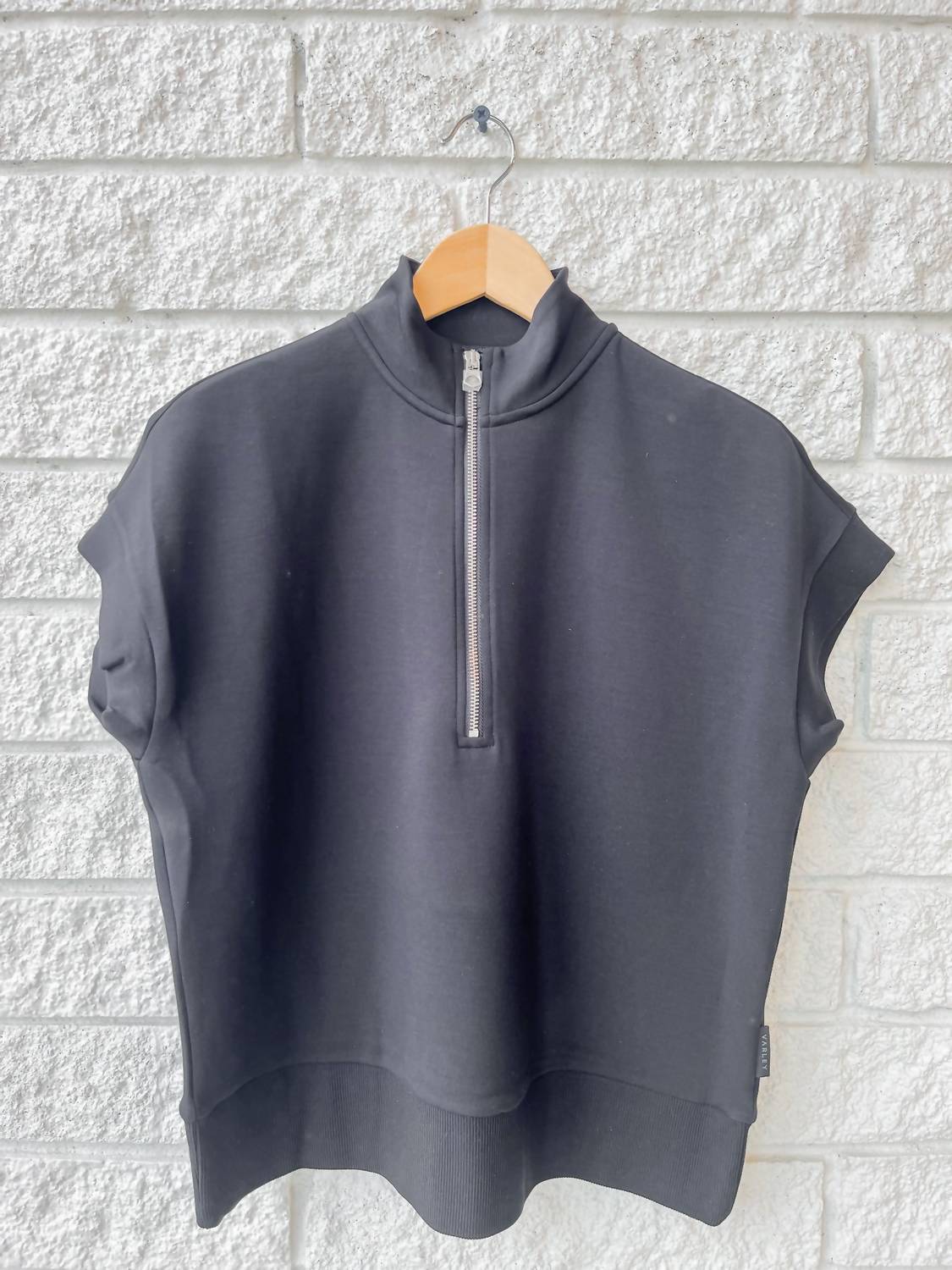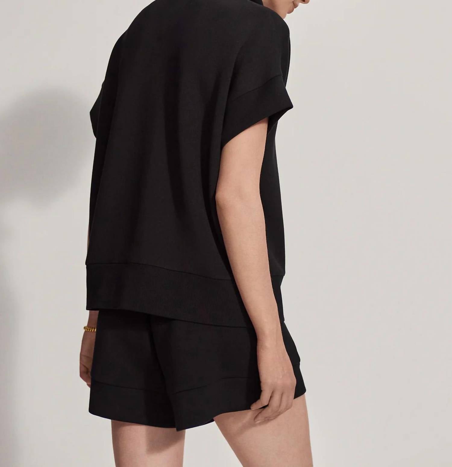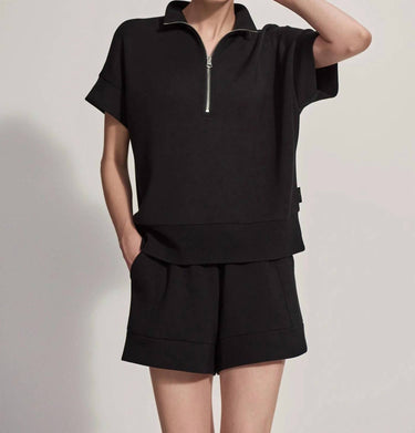 Upgrade your activewear collection with the Ritchie Short Sleeve Sweat Top by VARLEY, designed for minimalist style in a solid black color. This sweat top features a mockneck, and a convenient half zip closure with dropped shoulders for relaxed sophistication. Composition: 81% Viscose, 15% Polyester, 4% Elastane. Care: Machine wash, tumble dry. Ideal for spring vacation wear.