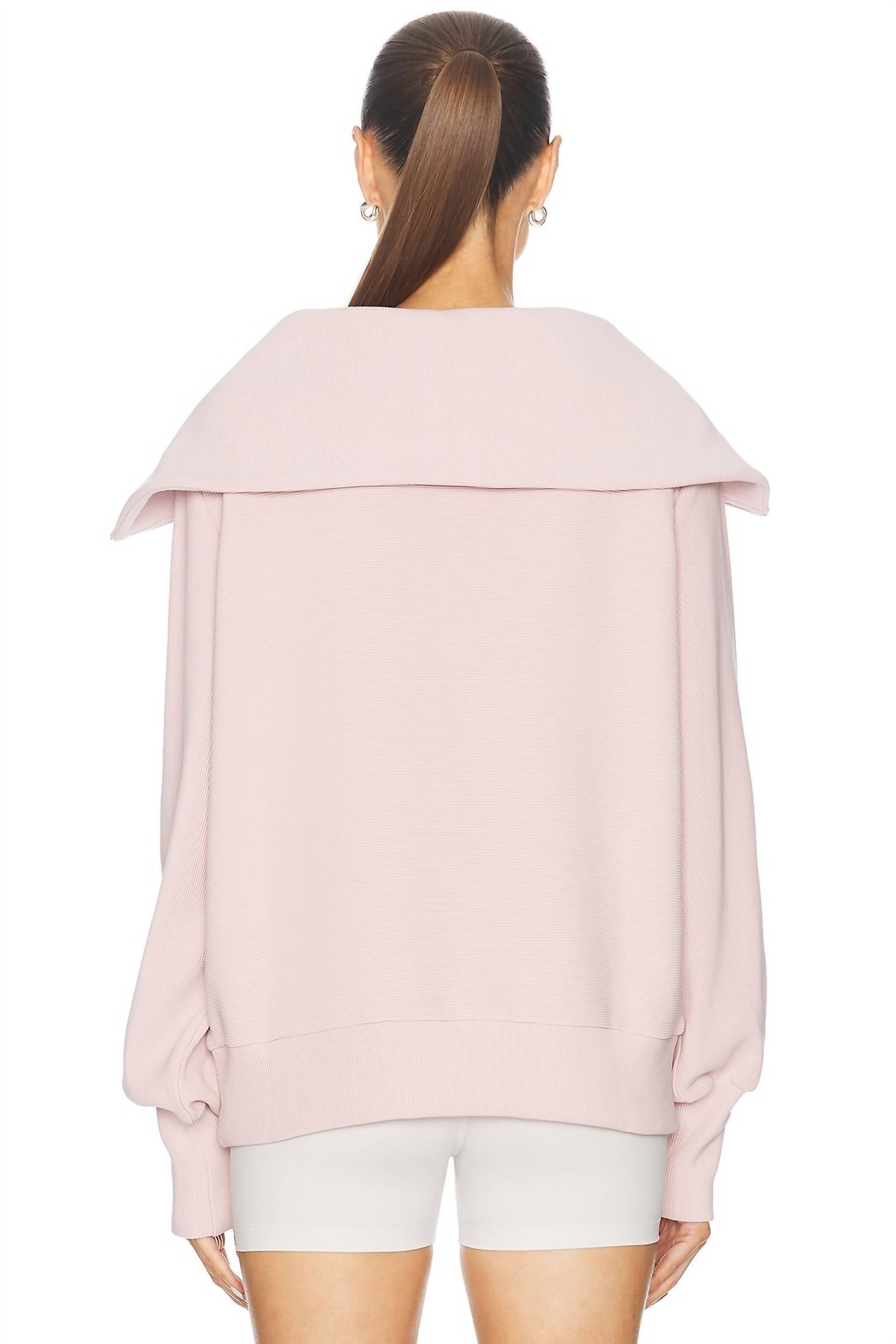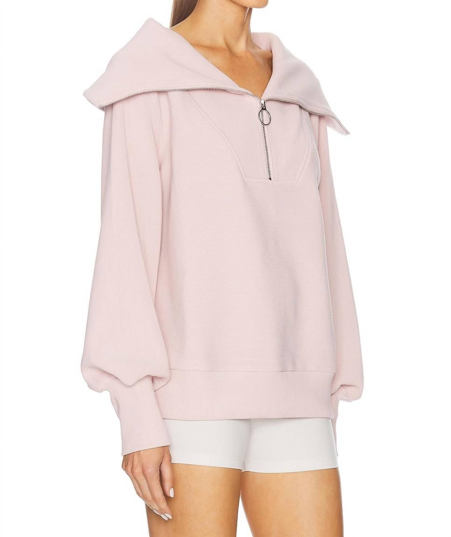Introducing the VARLEY Vine Half Zip Sweatshirt in a stunning burnished lilac, perfect for adding texture to your wardrobe. Crafted from a cotton blend, this long sleeve design features a funnel neckline with a front zipper closure, adding both style and convenience. It is made from 53% cotton, 46% polyester, and 1% elastane, offering a comfortable fit with a ribbed knit texture. Proudly made in China, it is machine washable and should be laid flat to dry for long-lasting wear. With a garment length of 24 inches on size small, this sweatshirt combines fashion and functionality effortlessly.