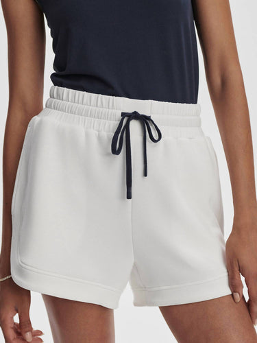 Discover the Women's Ollie High Rise Short by VARLEY, your go-to piece for vacation-ready style. Designed in a minimalist solid white, this short combines high waist comfort with functionality, featuring convenient pockets and a tie closure. Perfect for a summer getaway.