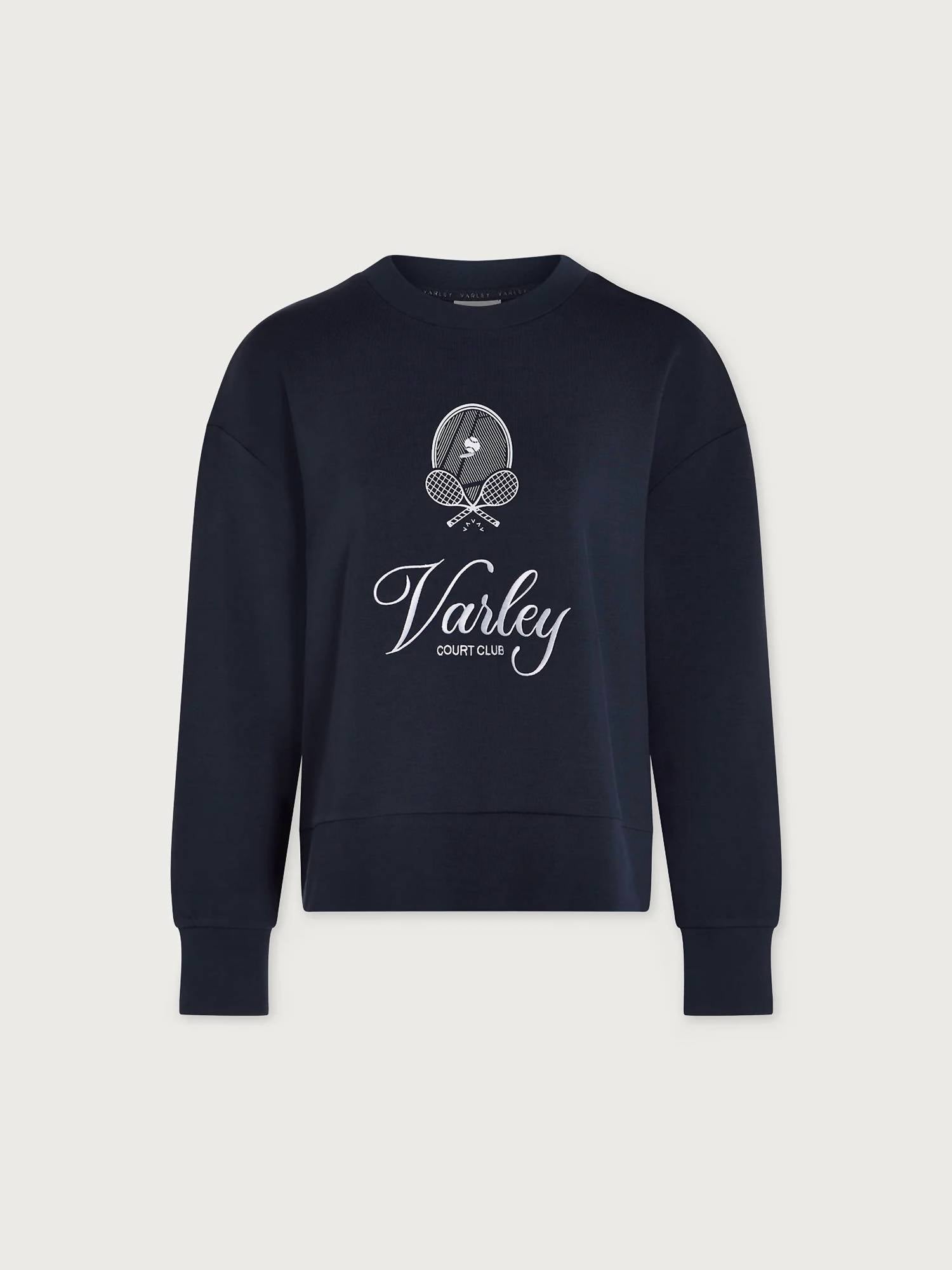 The Women's Rasco Namesake Sweatshirt by VARLEY is a stylish and cozy addition to your wardrobe, perfect for a streetwear-inspired vacation look. It features long sleeves and a comfortable crewneck design in a striking navy graphic pattern. Made for women, this casual chic piece offers easy wearability with its convenient pull-on closure. Please note that there are no pocket details, and specific care instructions are not provided.