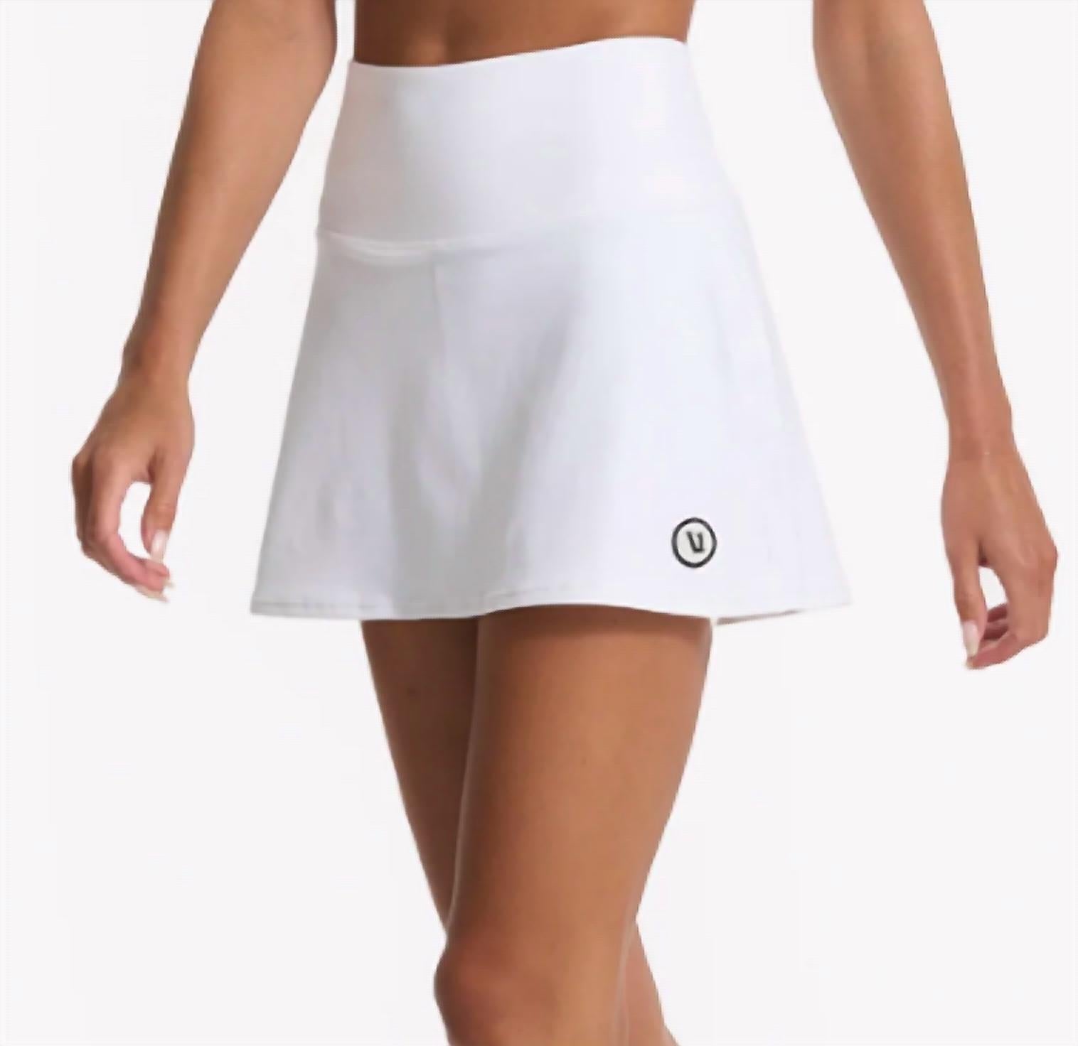 Dress this pencil skirt up with a blazer or down with your favorite tee. So versatile and timeless. Introducing the Women's Volley Skirt by Vuori, an athleisure essential in a crisp white hue. This solid high-rise pencil skirt features a comfy inner short, enhancing its function with side and tennis ball pockets. Made from sweat-wicking BreatheInterlock™ nylon, it ensures comfort on and off the court. The pull-on style makes it perfect for game day, and it's easy to maintain with a simple machine wash.