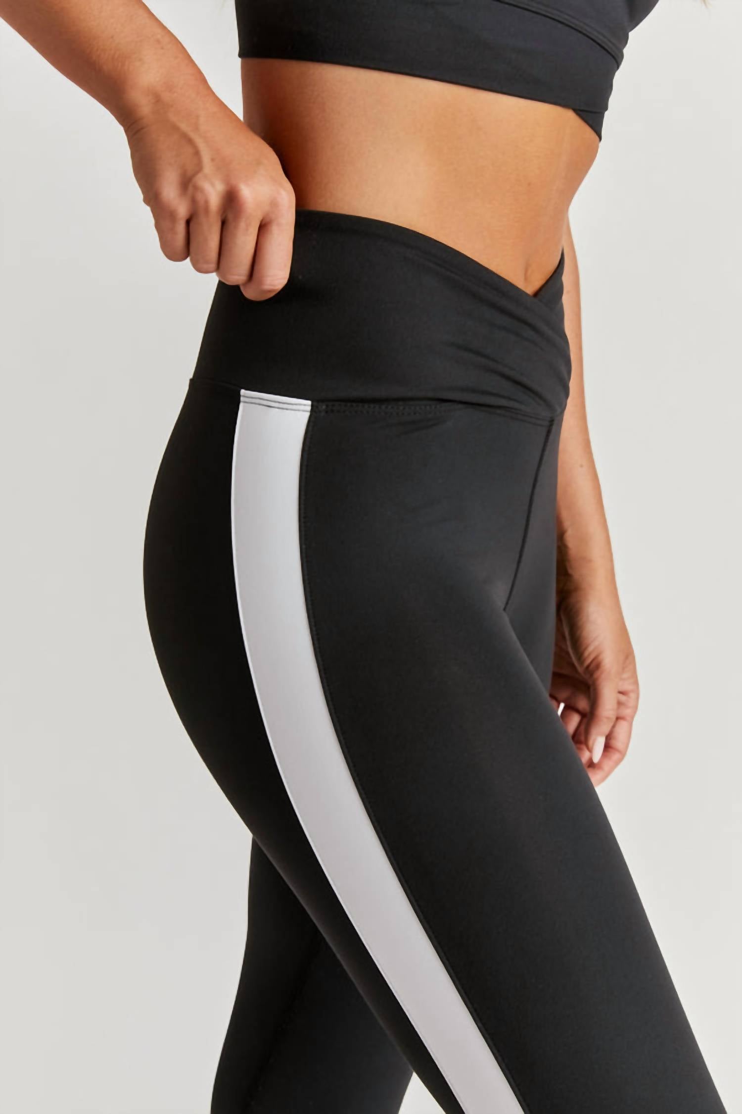 These women's leggings in black and white feature a high-rise fit with a crossover waistband, enhanced by a contrast side stripe for added flair. With a skinny leg style, they boast a 23" inseam and a 9.38" front rise, crafted from 82% Polyester and 18% Spandex Sport Interlock fabric. Made in the USA, they're easy to care for with a machine wash cold and lay flat to dry, and offer a pull-on closure for convenience.