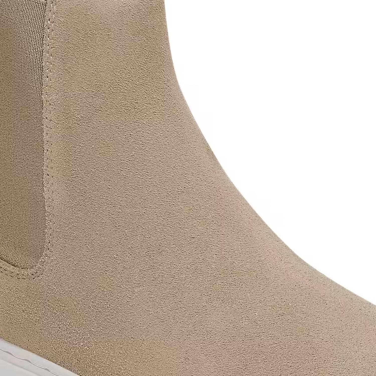 Sleek design meets unmatched comfort. Mid-top sneakerboot boasts a velvety classic suede upper and a contoured cork-latex footbed. Crafted in Germany. Ensuring a perfect blend of style and support. Features a pull-on design and stretch side gusset for effortless wear. Complemented by a natural rubber sole. Designed to keep you comfortably on your feet block after block. Rounded toe shape adding to its timeless appeal.