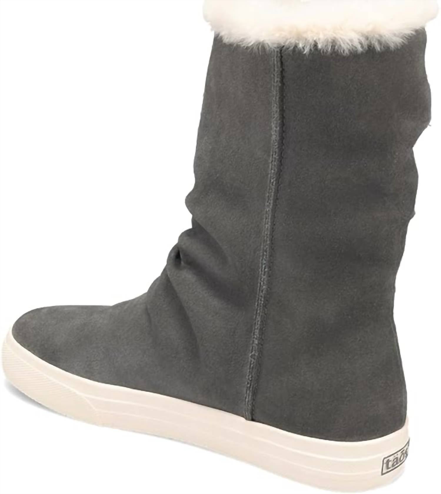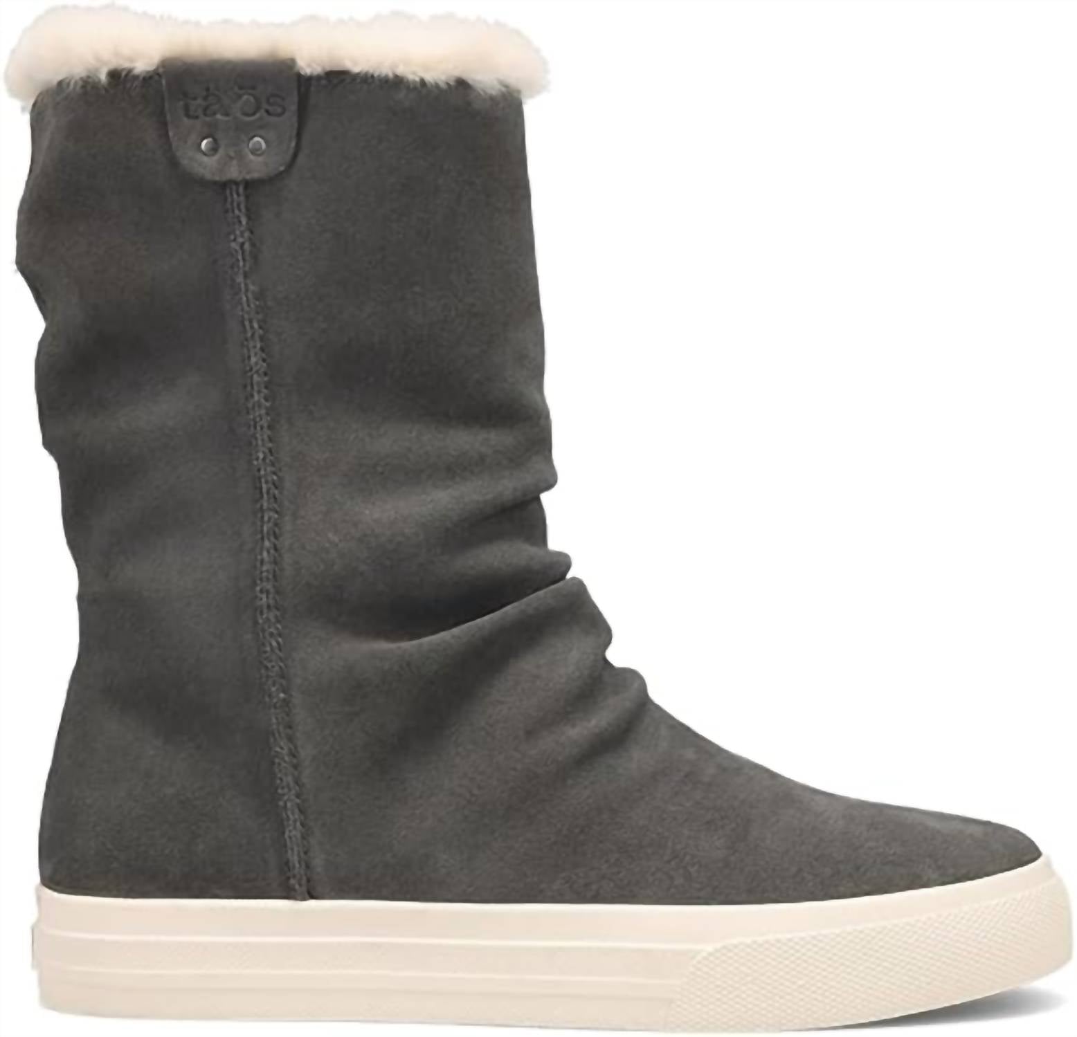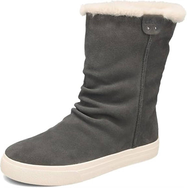 Rainy day? No problem! The cutest and most comfortable rainboots of the season. Experience ultimate comfort and style with the Women's Cozy Chic Boot by Taos in a chic Dark Grey Suede. This winter boot boasts a 7 1/2" shaft height and a boot circumference of 13 3/8", designed with a water-resistant suede upper and lined with faux fur for warmth. Its Curves & Pods® removable footbed offers arch and metatarsal support, while a 2" heel height ensures a comfortable stride complemented by forefoot cushioning. With a flexible rubber outsole, this orthotic-friendly boot is perfect for any occasion, from après ski to everyday travel. Care: Buff with leather cleaner or polish and wipe off with a dry cloth.