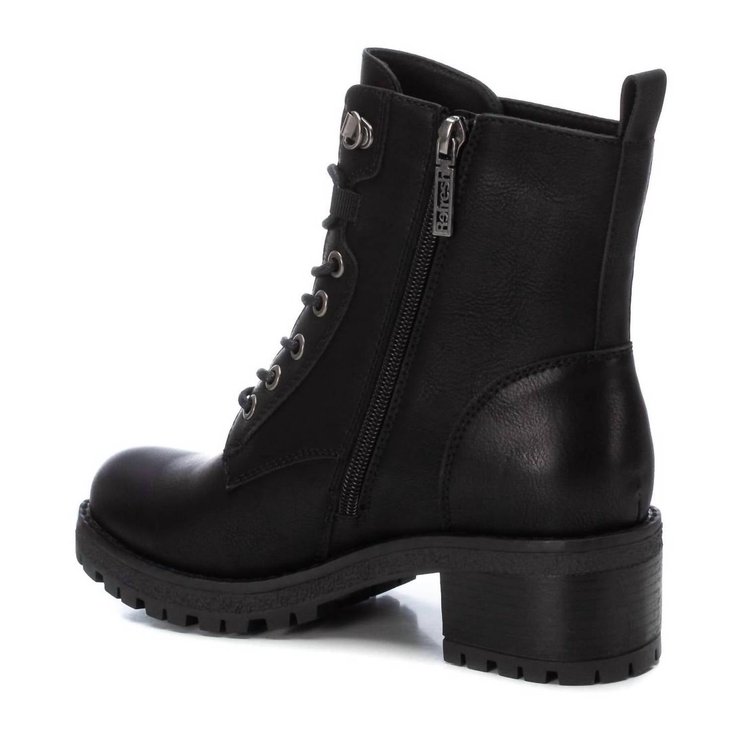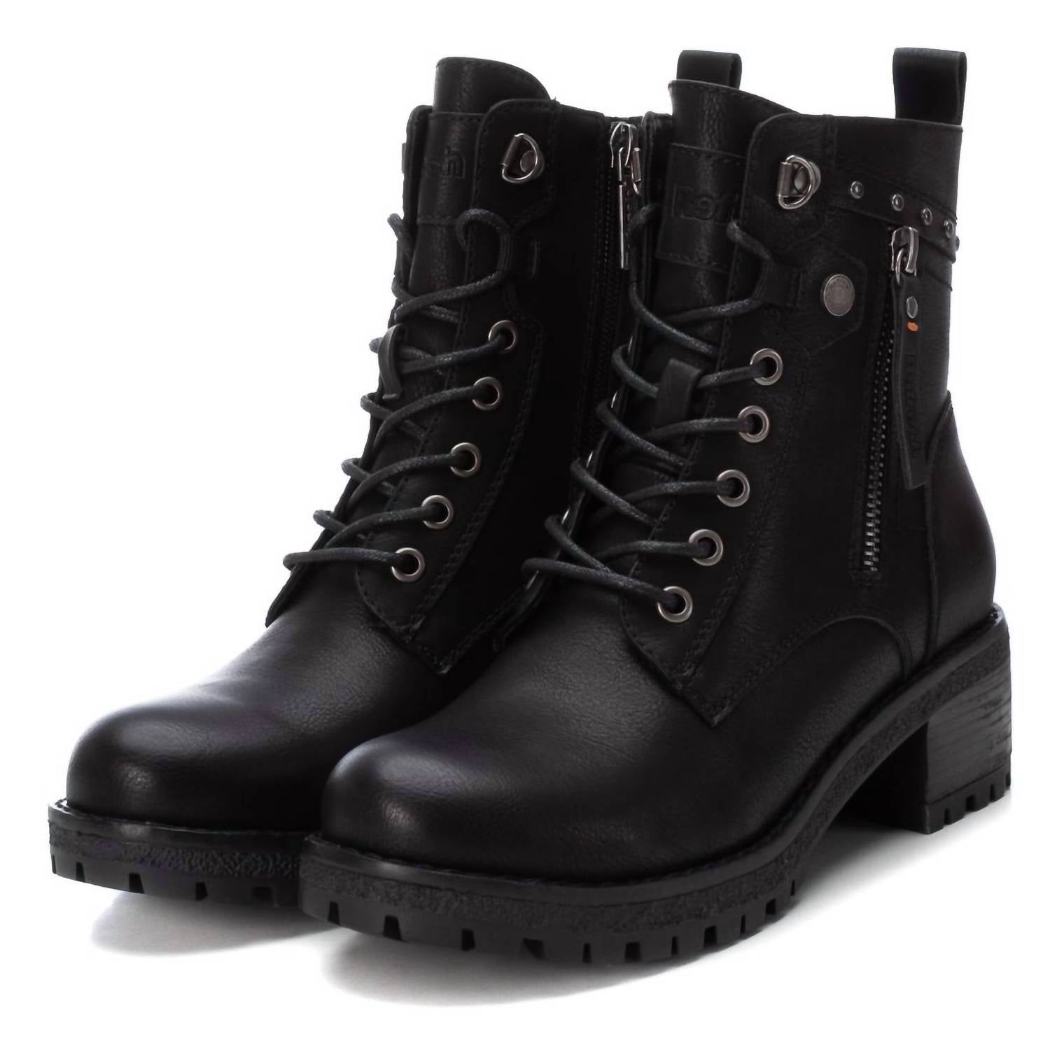 This Casual Bootie features faux leather, a side zipper, lace-up closure, and a 1.96-inch block heel, with decorative metallic details and a non-slip rubber sole for style and comfort.