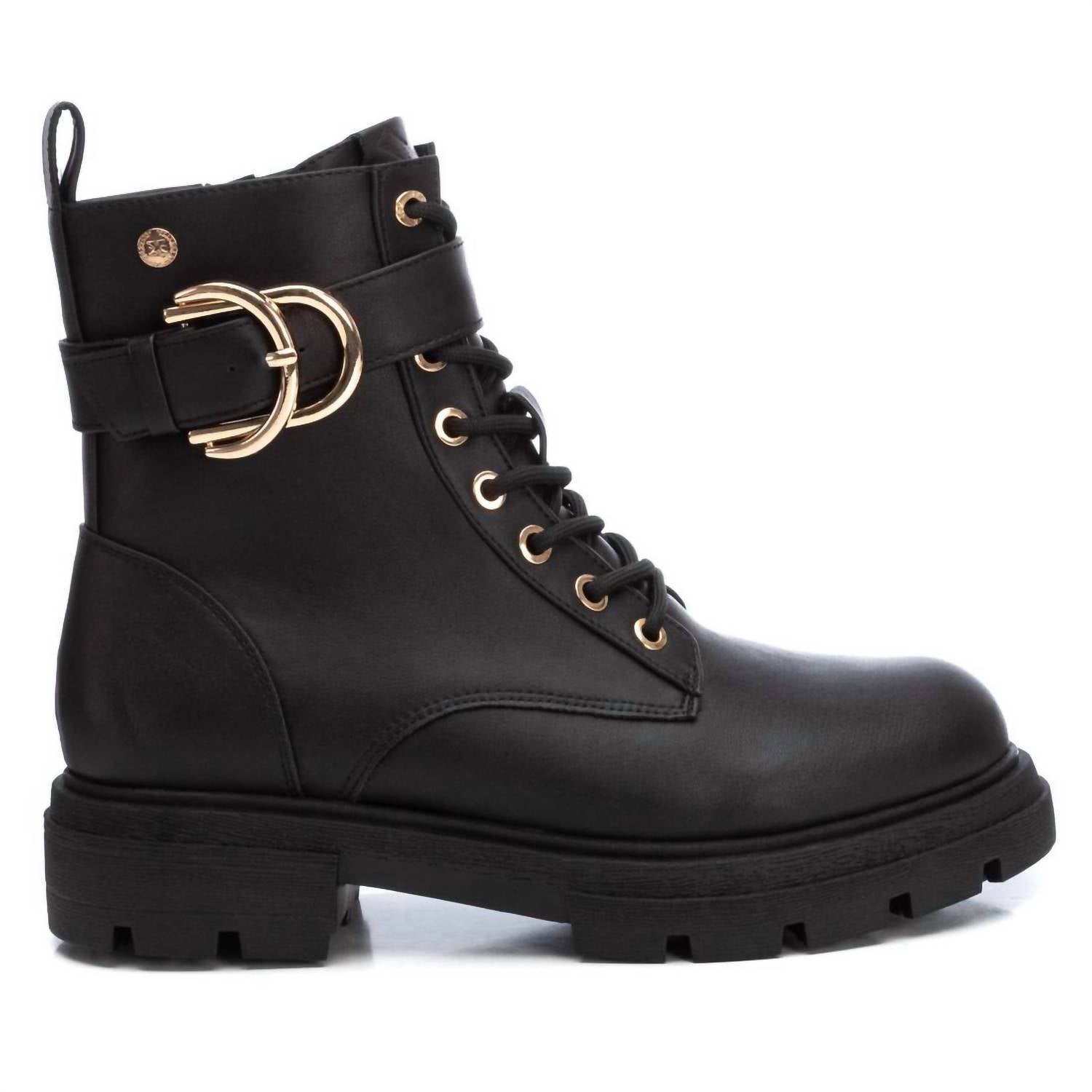 Made of material that imitates skin. Decorative collar with gold details. Military style boot. Side zipper closure and adjustable laces. Rear puller for easy putting on.