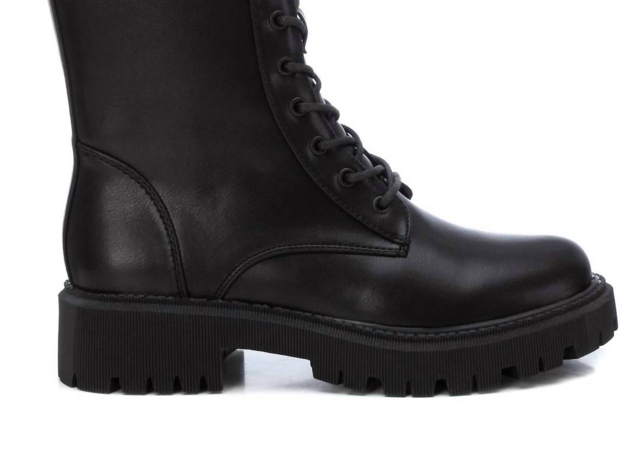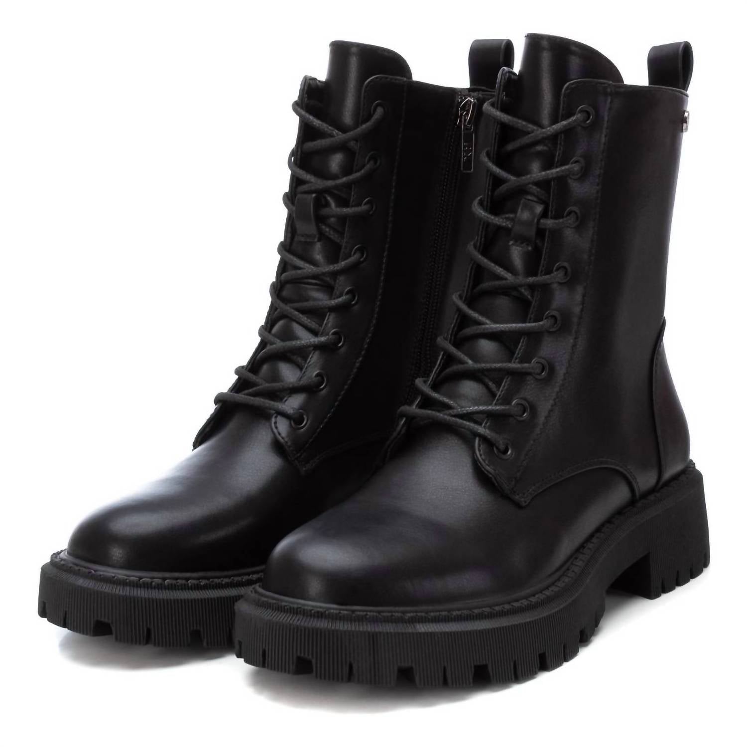 Elevate your style with the Women's Combat Booties by Xti, designed in a chic faux leather finish. These booties feature a block heel measuring 1.57 inches, combining casual appeal with comfort through a lightweight, non-slip rubber sole. Featuring a round toe, the design integrates a side zip closure and lace-up fastening for easy wear and an adjustable fit. Proudly certified vegan by PETA, these ankle boots are a wardrobe staple for winter, offering both style and function.