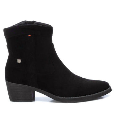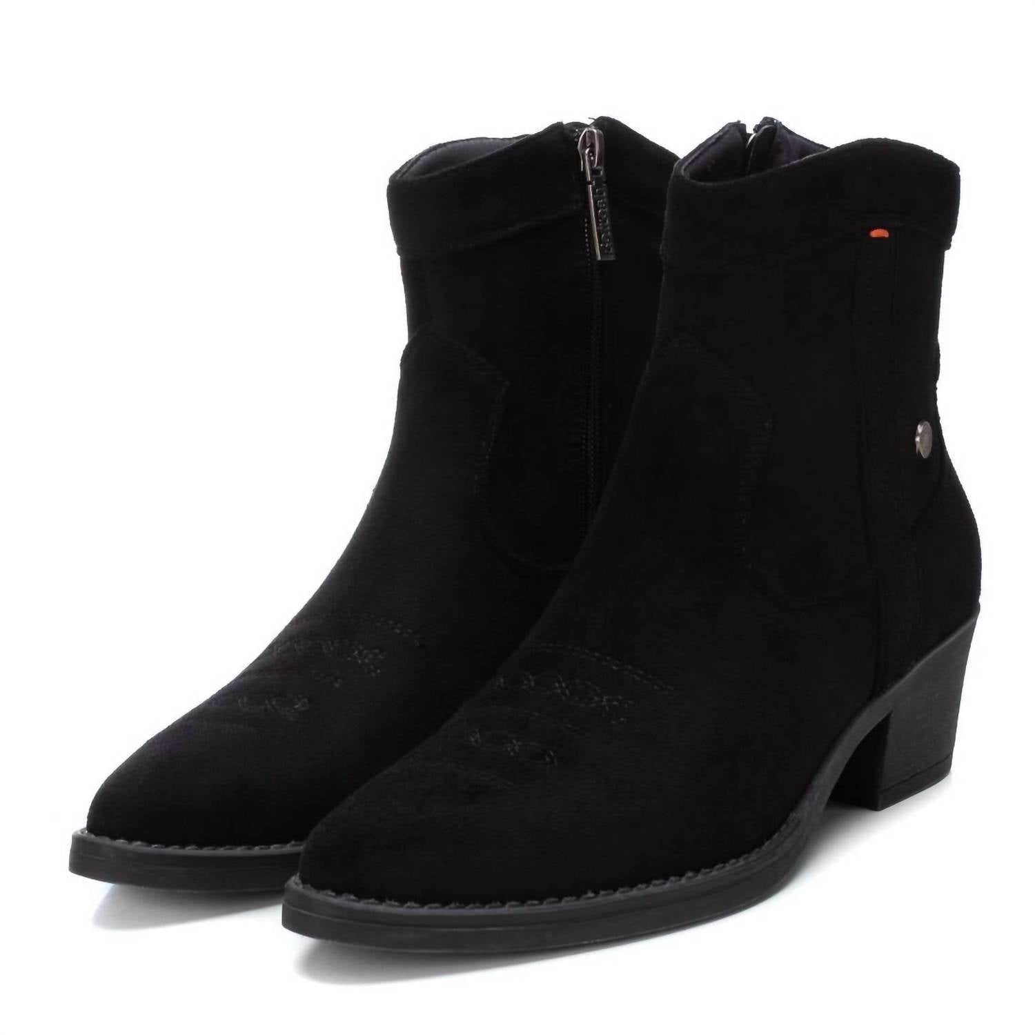 This Women’s Italian Western Booties offers a 2.36-inch block heel with black suede and embroidered details, featuring a pointed toe and side zipper closure. Its non-slip rubber sole and padded insole provide comfort and style.