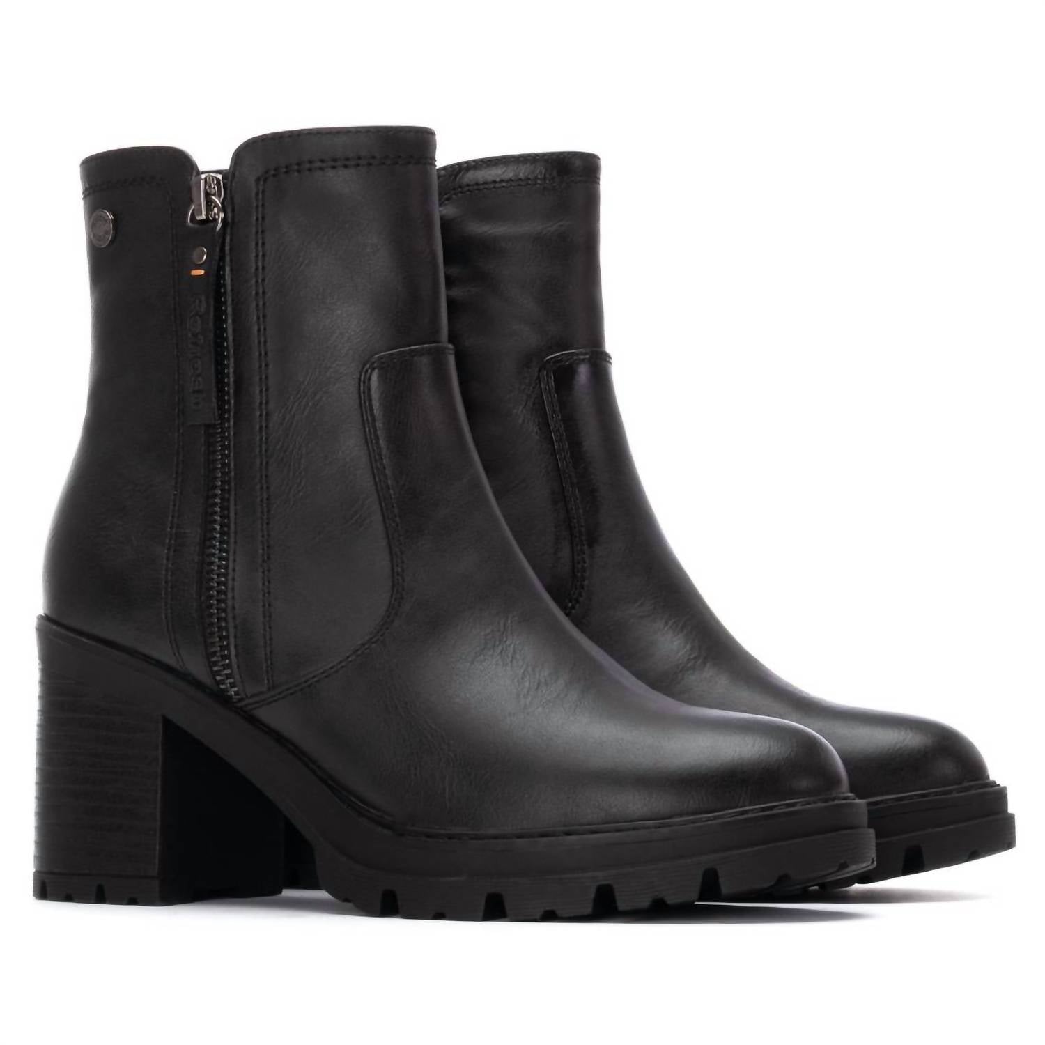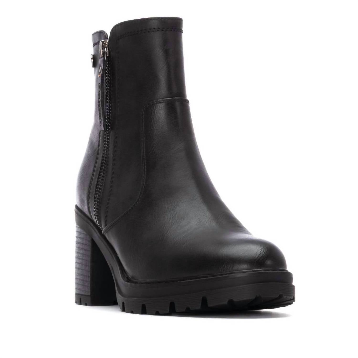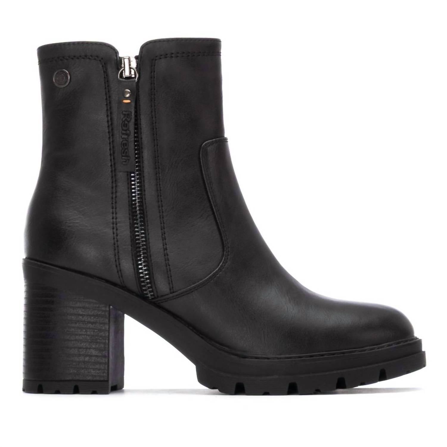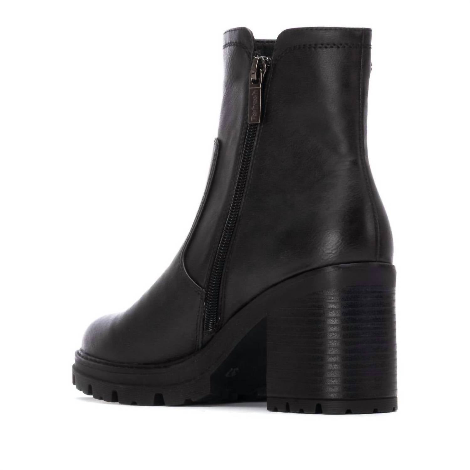 Elevate your wardrobe with the Women's Refresh Ankle Booties by Xti, perfect for evening events and trendy fall outings. Crafted from soft faux leather in a chic black hue, these booties feature a stylish 8cm block heel and a secure interior zip closure with an additional decorative side zip. Proudly certified vegan by PETA, they ensure both style and ethical fashion with their non-slip rubber sole and removable insole. Effortlessly versatile, these high-heeled round toe booties combine vintage charm with modern comfort, making them an essential addition to your New Year's Eve ensemble.