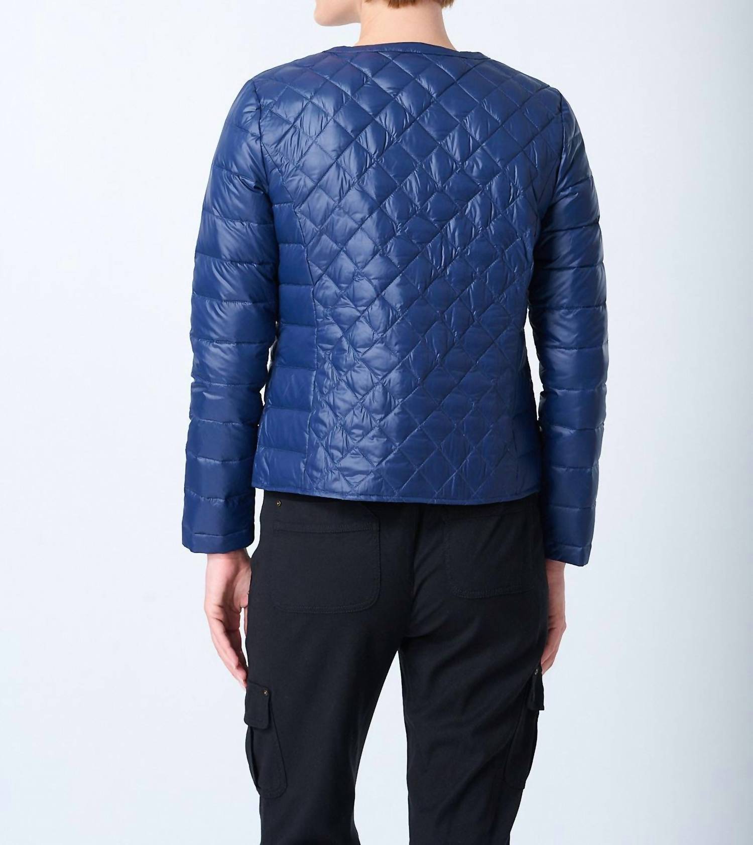 This women's jacket features long sleeves and a durable 100% nylon shell filled with premium down insulation for warmth. Designed with a tailored fit, it includes a zip closure reinforced by a snap front placket and two side pockets with zippers. Machine wash cold on a gentle cycle, tumble dry low with tennis balls, and cool iron if needed.