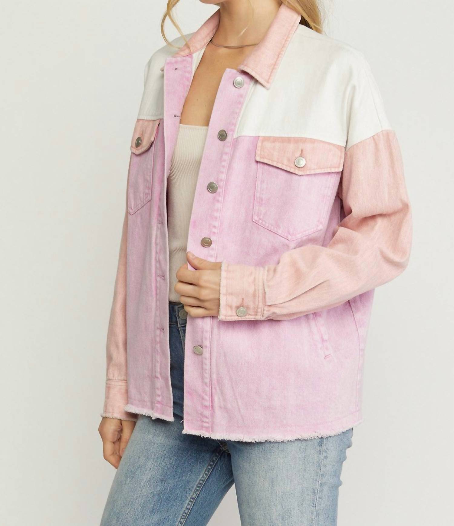 This jacket features a classic collar, a button down front, dropped shoulders, long sleeves with a button closure at the wrist, pockets at the bust and sides, a frayed hemline, a colorblock design and an oversized silhouette. Medium weight. Small Bust 44" Length 24", Medium Bust 46" Length 24", Large Bust 48" Length 24", XL Bust 54" Length 28", 1X Bust 56" Length 28", 2X Bust 58" Length 28". 100% Cotton. Model is 5'9" and wearing size small. Plus model is 5'11" and wearing size XL. Hand wash cold, line dry. no bleach.