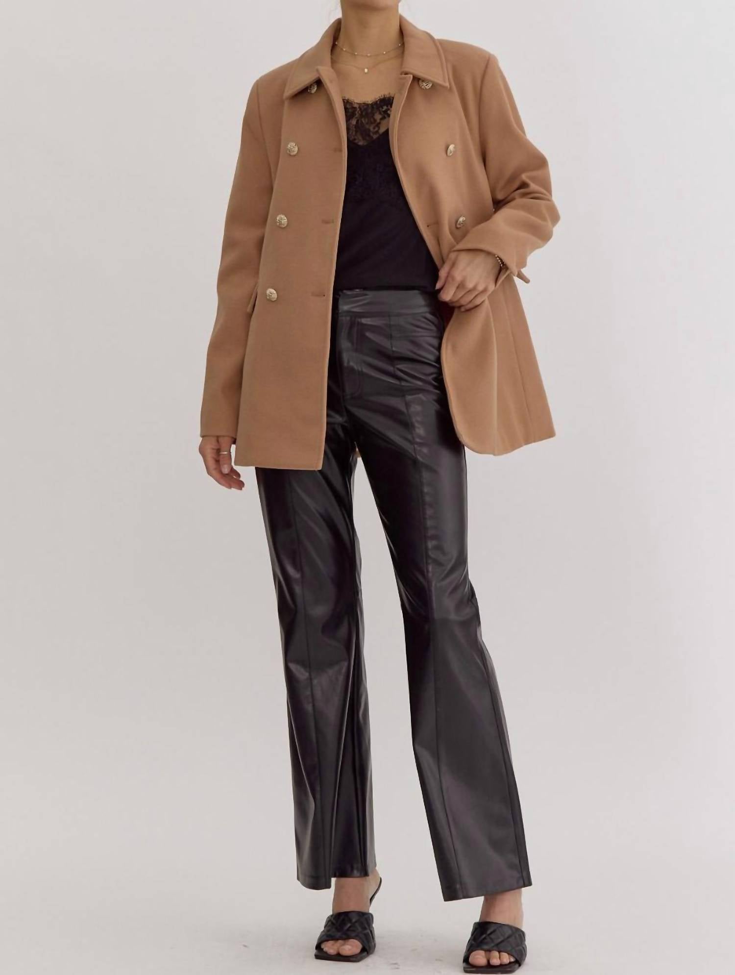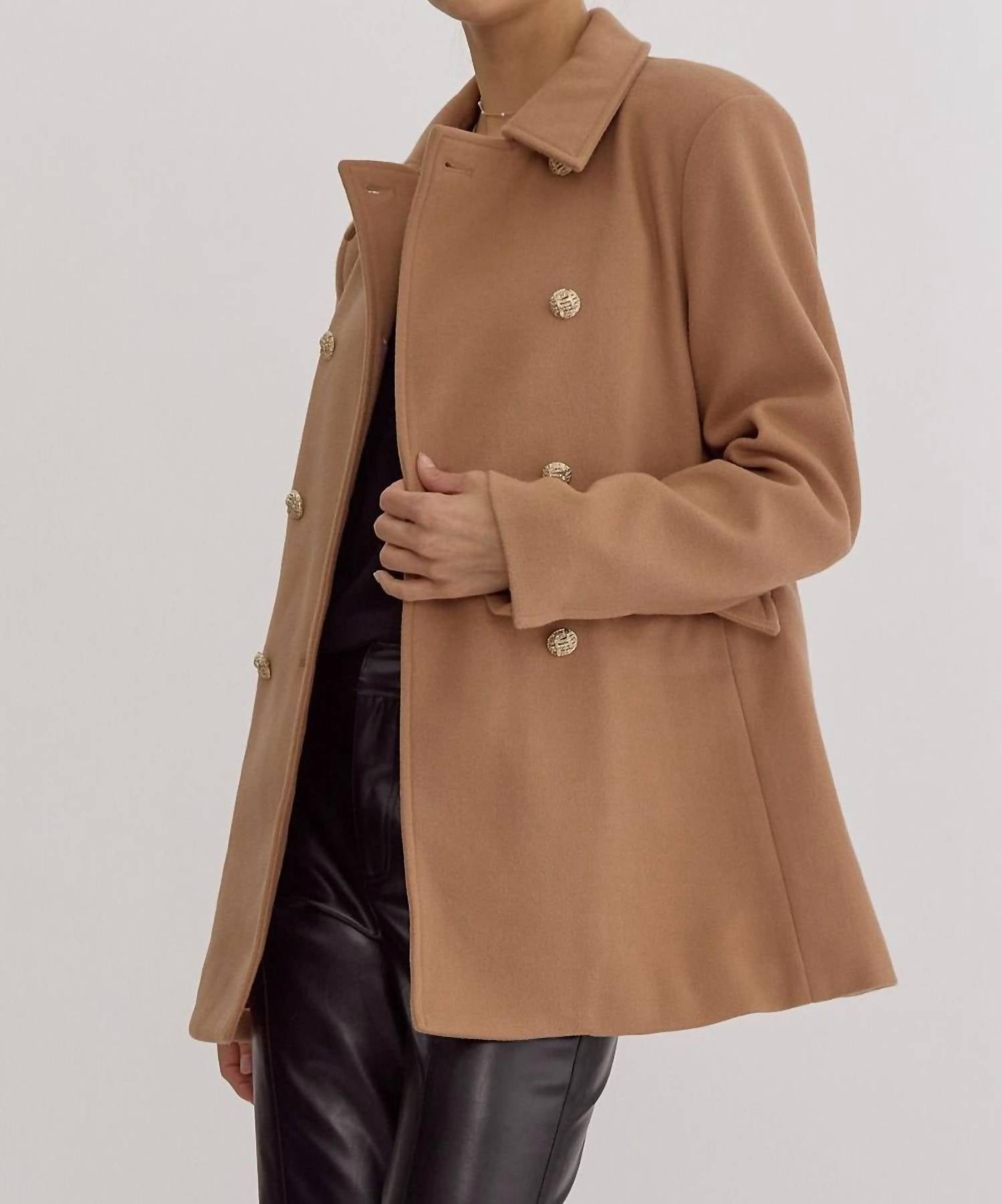 Solid tan statement piece perfect for holiday parties and workwear alike. Crafted with a long sleeve design from 95% Polyester and 5% Spandex, mediumweight faux wool jacket adds sophistication with its double button front and cuff slit detail. Additional features include a lined interior and front pocket for practical style. Dry clean only. Model is 5'10" and is wearing a size Small.