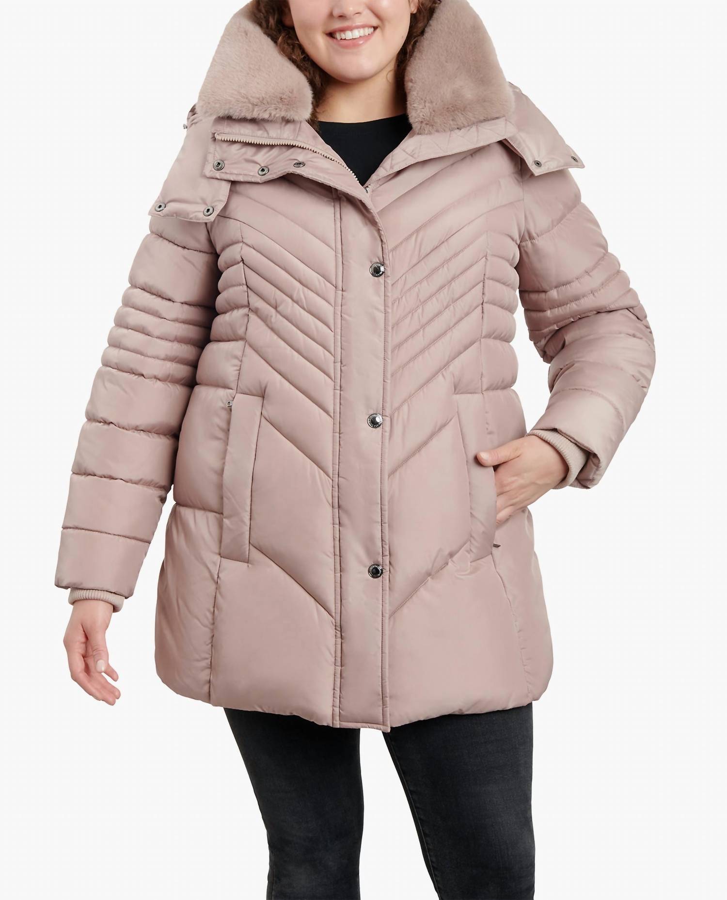London Fog - Plus Size Zip-front Hooded Puffer Jacket With Button-off Fur Collar