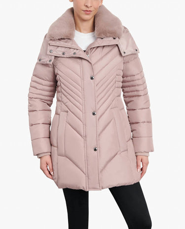 London Fog - Zip-front Hooded Puffer Jacket With Button-off Fur Collar