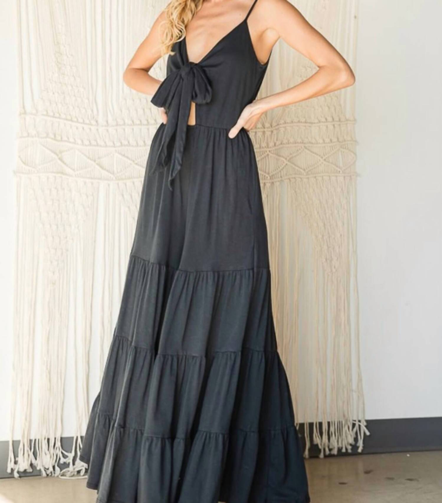The Brinley Tie Front Jumpsuit by BUCKETLIST is a chic addition to your casual wardrobe. Sleeveless and designed for versatility, this charcoal jumpsuit boasts a trendy tie front closure and a stylish tiered wide leg. Made from a soft jersey knit, composed of 90% Polyester and 10% Cotton, it offers comfort and a lightweight feel perfect for any occasion. Hand wash only.