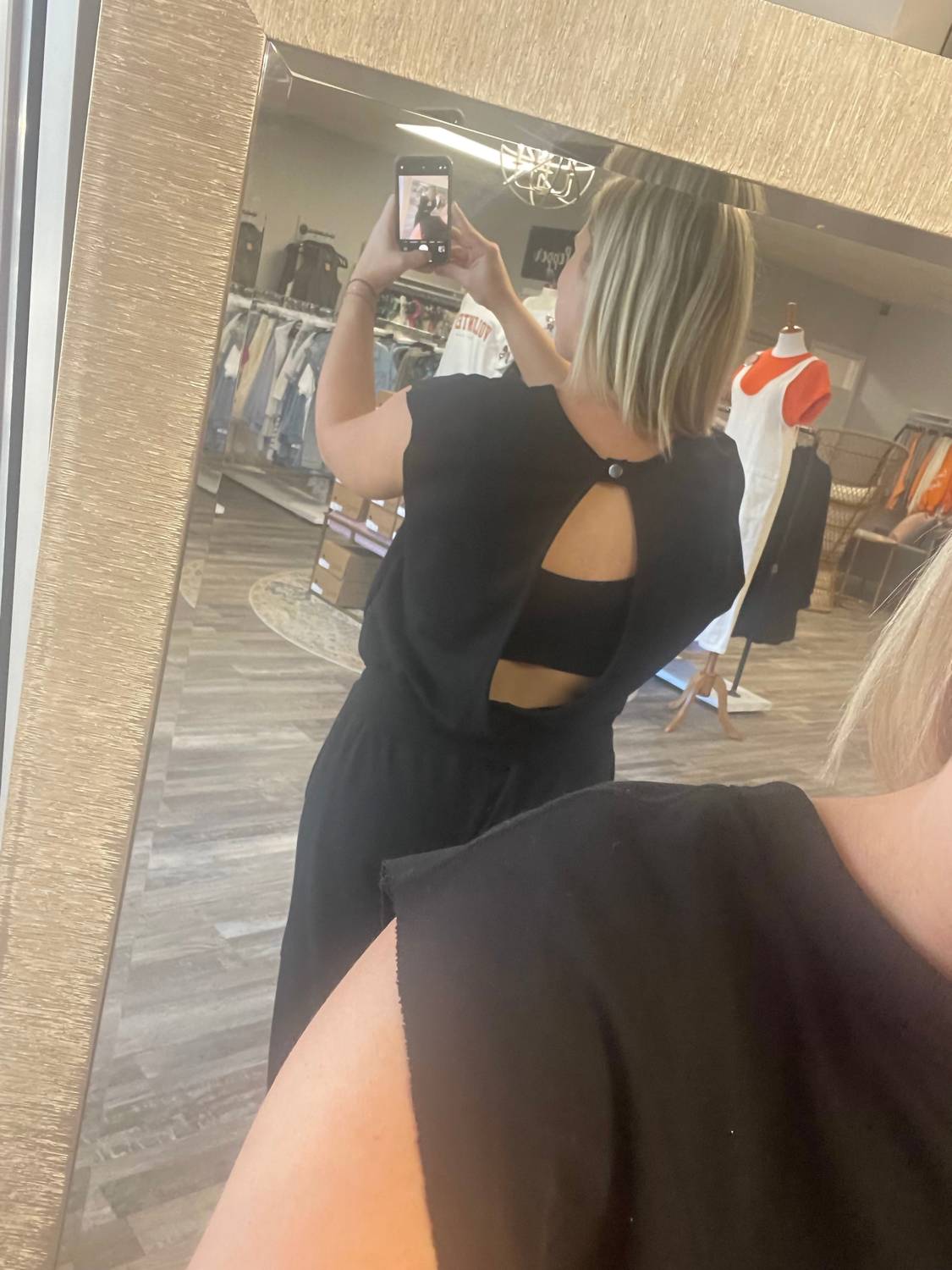 Step into effortless comfort with the Oversized Terry Knit Jumpsuit by Entro in classic black. This sleeveless piece features a rounded neckline with a stylish back cutout, offering a laid-back yet chic look. The jogger-style pants come with an adjustable waist and convenient pockets, providing both comfort and functionality. Closure: Snap closure. The slouchy fit runs true to size, and if you're between sizes, it's suggested you size down.