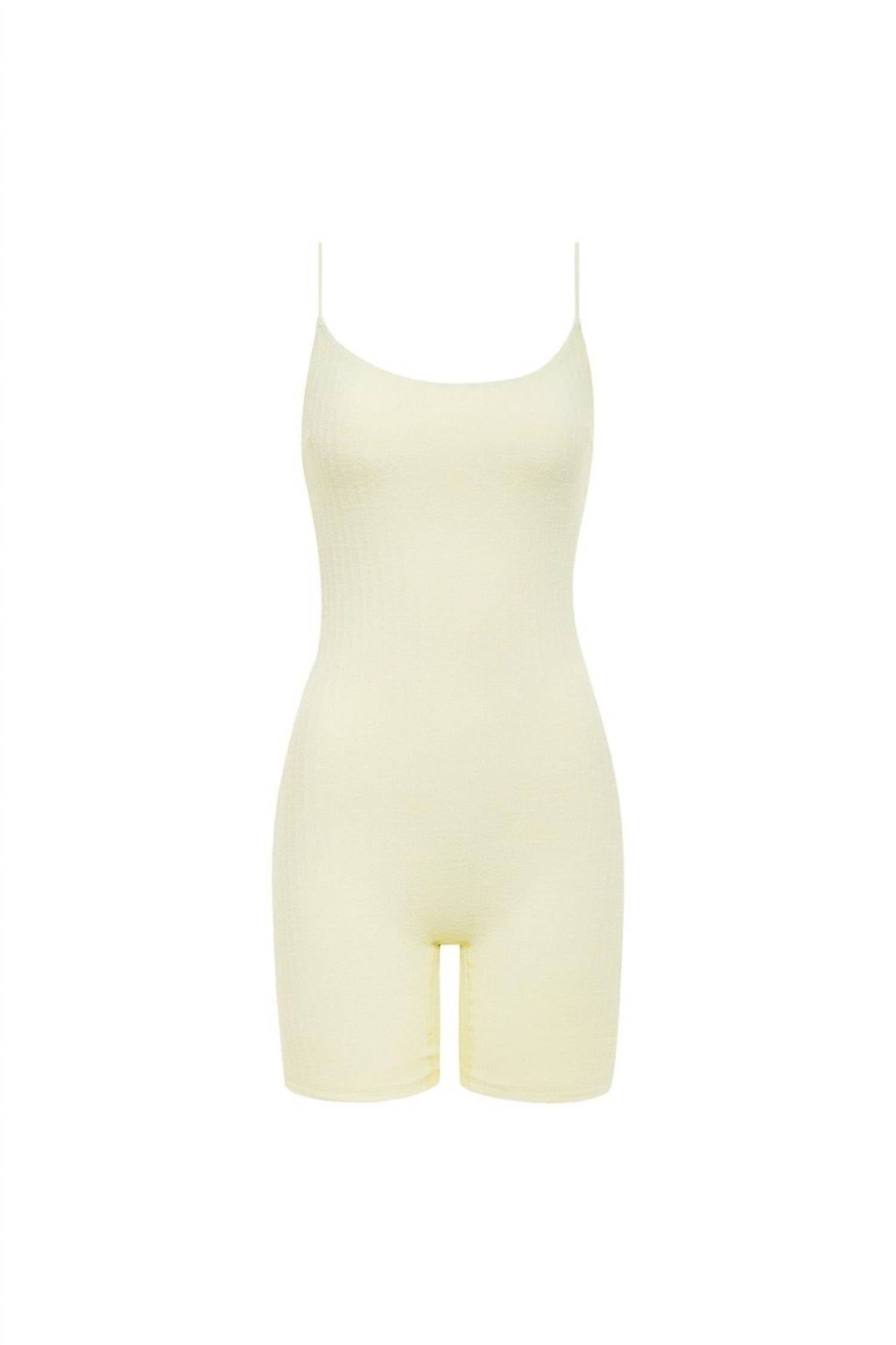 Meet the Alina Midi Onesie by Montce, a textured masterpiece in buttercream rib that seamlessly blends style and comfort. This women's jumpsuit features adjustable thin shoulder straps with a tie closure and a low-scooped back, perfect for supporting athleisure trends in spring. Crafted from a delicate ribbed terry cloth, the nylon/spandex blend and Lycra lining offer superior comfort, with fabric imported from Spain, ensuring quality and style. Care for this eye-catching piece is simple with machine wash and tumble dry instructions, and it boasts an approximate 6” inseam for that perfect midi leg length.