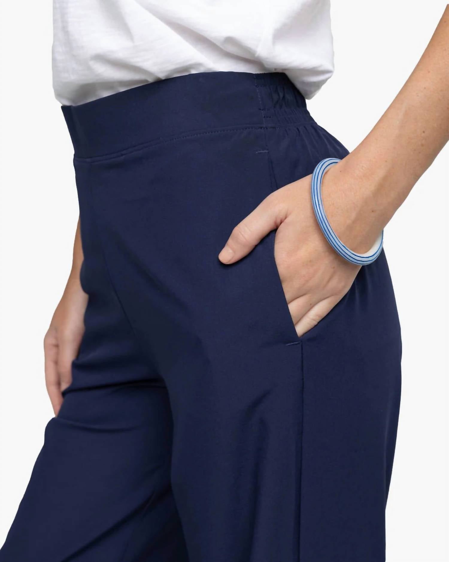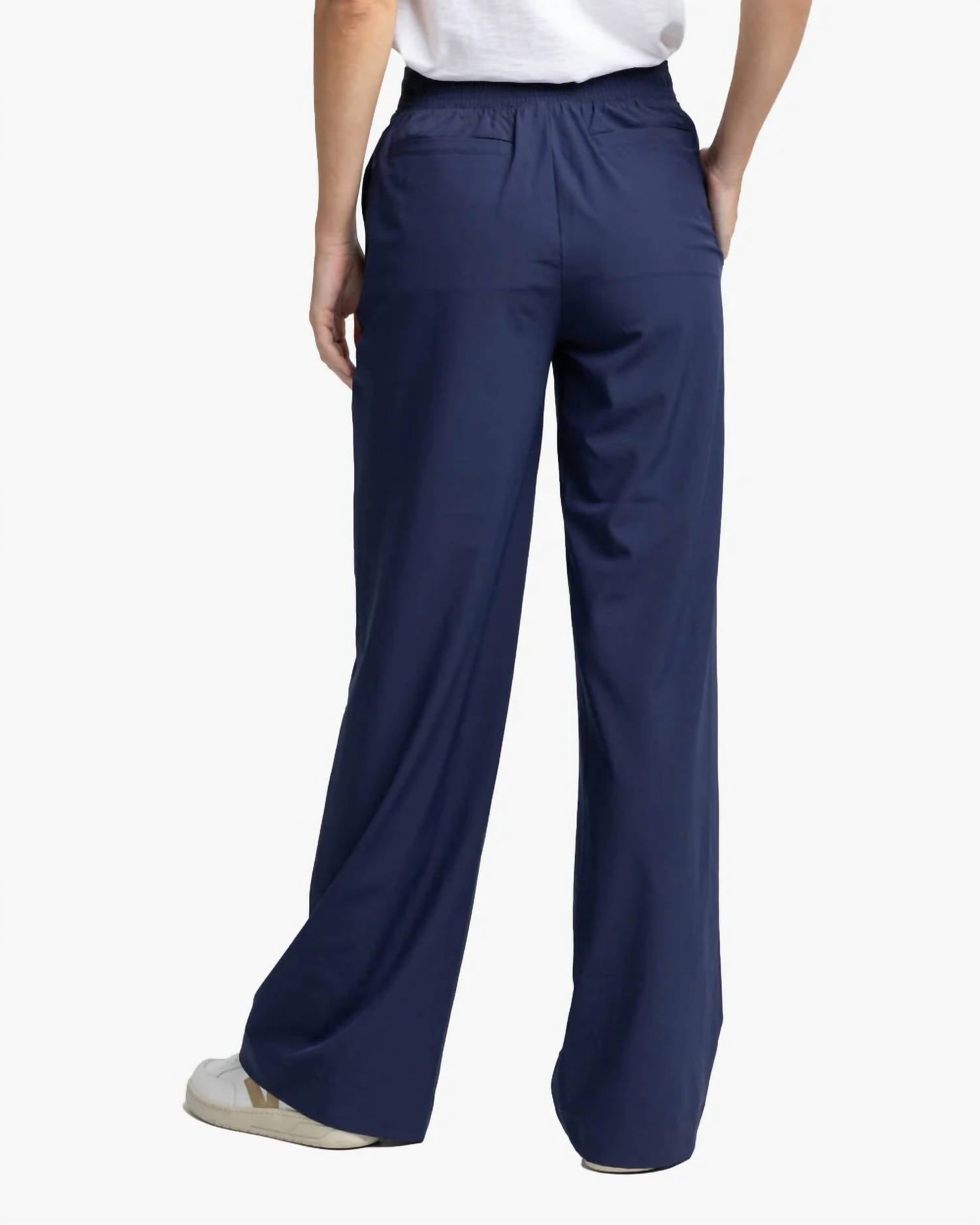Introducing the Teegan Pant by Southern Tide, a stylish choice for comfort and elegance in a nautical navy hue. These full-length, wide-leg pants feature a flattering flat front waistband with an elastic back and convenient front on-seam pockets. Crafted from a blend of 90% polyester and 10% spandex, they offer a pull-on closure for easy wear. Care instructions suggest machine washing cold with like colors, avoiding bleach, and tumble drying low with a warm iron if needed. The inseam measures 31.5 inches. Models are 5'8.5-5'9" wearing a size extra small.
